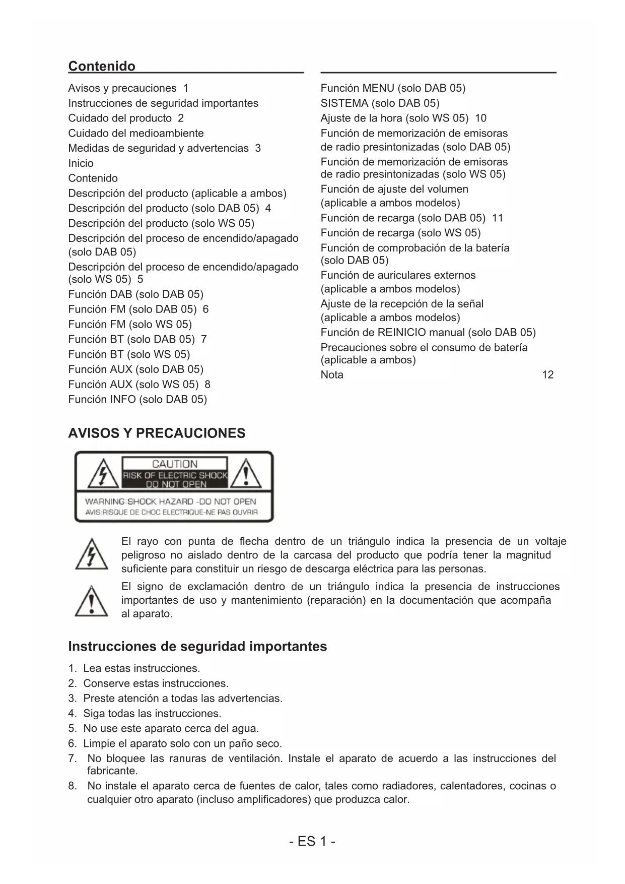 LE ROGAMOS QUE LEA ÍNTEGRAMENTE EL PRESENTE MANUAL DEL USUARIO ANTES DE UTILIZAR EL EQUIPO Y QUE CONSERVE ESTE FOLLETO PARA PODER CONSULTARLO EN EL FUTURO. ES- ES 1 - Contenido Avisos y precauciones 1 Instrucciones de seguridad importantes Cuidado del producto 2 Cuidado del medioambiente Medidas de seguridad y advertencias 3 Inicio Contenido Descripción del producto (aplicable a ambos) Descripción del producto (solo DAB 05) 4 Descripción del producto (solo WS 05) Descripción del proceso de encendido/apagado (solo DAB 05) Descripción del proceso de encendido/apagado (solo WS 05) 5 Función DAB (solo DAB 05) Función FM (solo DAB 05) 6 Función FM (solo WS 05) Función BT (solo DAB 05) 7 Función BT (solo WS 05) Función AUX (solo DAB 05) Función AUX (solo WS 05) 8 Función INFO (solo DAB 05) Función MENU (solo DAB 05) SISTEMA (solo DAB 05) Ajuste de la hora (solo WS 05) 10 Función de memorización de emisoras de radio presintonizadas (solo DAB 05) Función de memorización de emisoras de radio presintonizadas (solo WS 05) Función de ajuste del volumen (aplicable a ambos modelos) Función de recarga (solo DAB 05) 11 Función de recarga (solo WS 05) Función de comprobación de la batería (solo DAB 05) Función de auriculares externos (aplicable a ambos modelos) Ajuste de la recepción de la señal (aplicable a ambos modelos) Función de REINICIO manual (solo DAB 05) Precauciones sobre el consumo de batería (aplicable a ambos) Nota 12