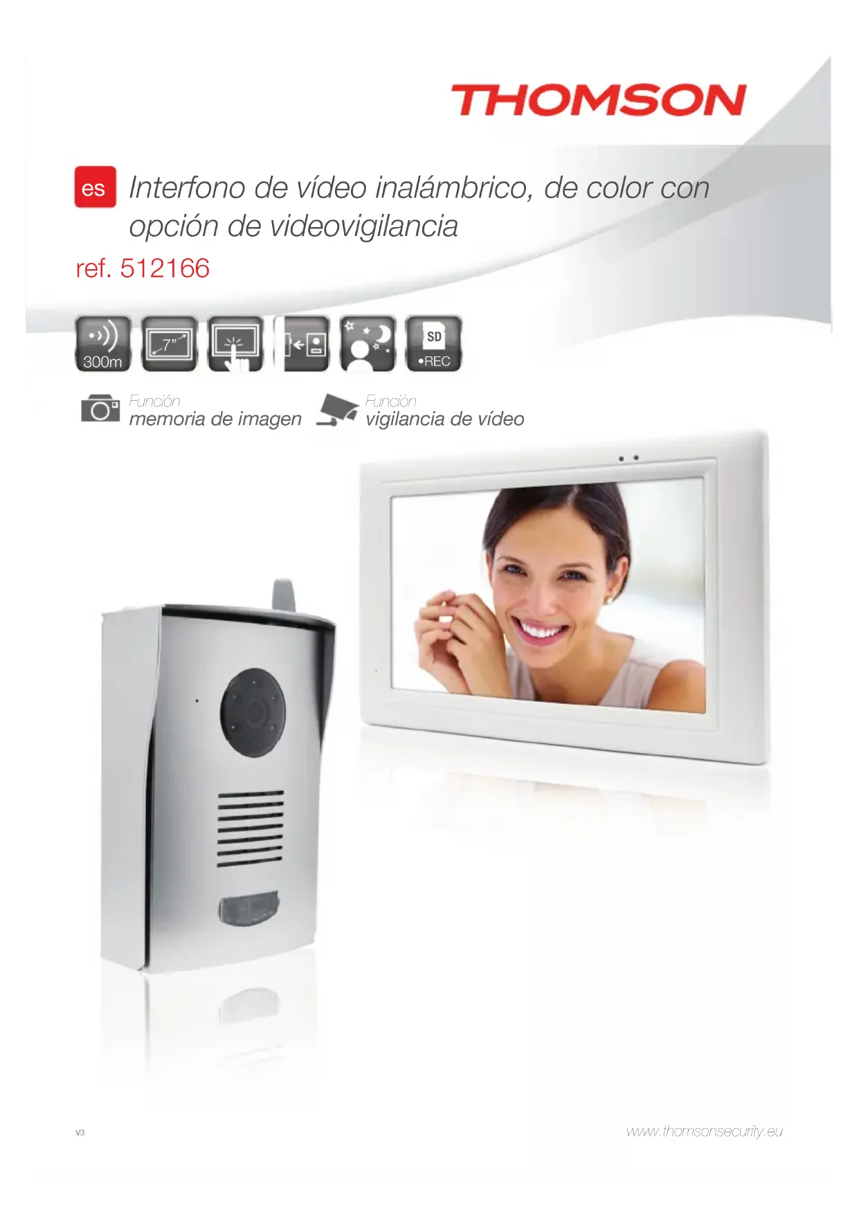 El interfono de vídeo de color táctil Thomson es un interfonodevídeodealtagamaquelepermitevera sus visitantes, comunicarse con ellos y gestionar el accesoalapropiedad.Lepermiteanunciarlapresencia de un visitante con el timbre, visualizarlo, contestarle y hablar con él, activar si lo desea la apertura de la cerradera eléctrica o la motorización de cancela (no suministradas). Laplacaexternaincluidaestádiseñadapararesistirala intemperieysejaensalienteaunpilarounapareddel recinto.Sucajadealuminioylaresistenciaqueofrece garantizanunfuncionamientoestableyduradero. La placa externa lleva LED infrarrojos para la visión nocturna, asociados a un sensor crepuscular que permitetenerunaimagenenblancoynegrodesus visitantesinclusoenlaoscuridadcompleta. Elmonitor graba unvídeocortodel visitanteenuna tarjetadememoria(nosuministrada)cadavezquese emiteunallamadadesdelaplacaexterna. El uso de la tecnología inalámbrica permite montar este aparato en sustitución y en lugar de un timbre alámbrico, por ejemplo, sin modicar la instalación existente. Puedeañadirhasta3cámarasinalámbricasadicionales (no suministradas, ref. 512167), para un uso en el interior o en el exterior, para activar las grabaciones pordeteccióndemovimientoenelcampodeunade lascámarasoporactivaciónmanual.