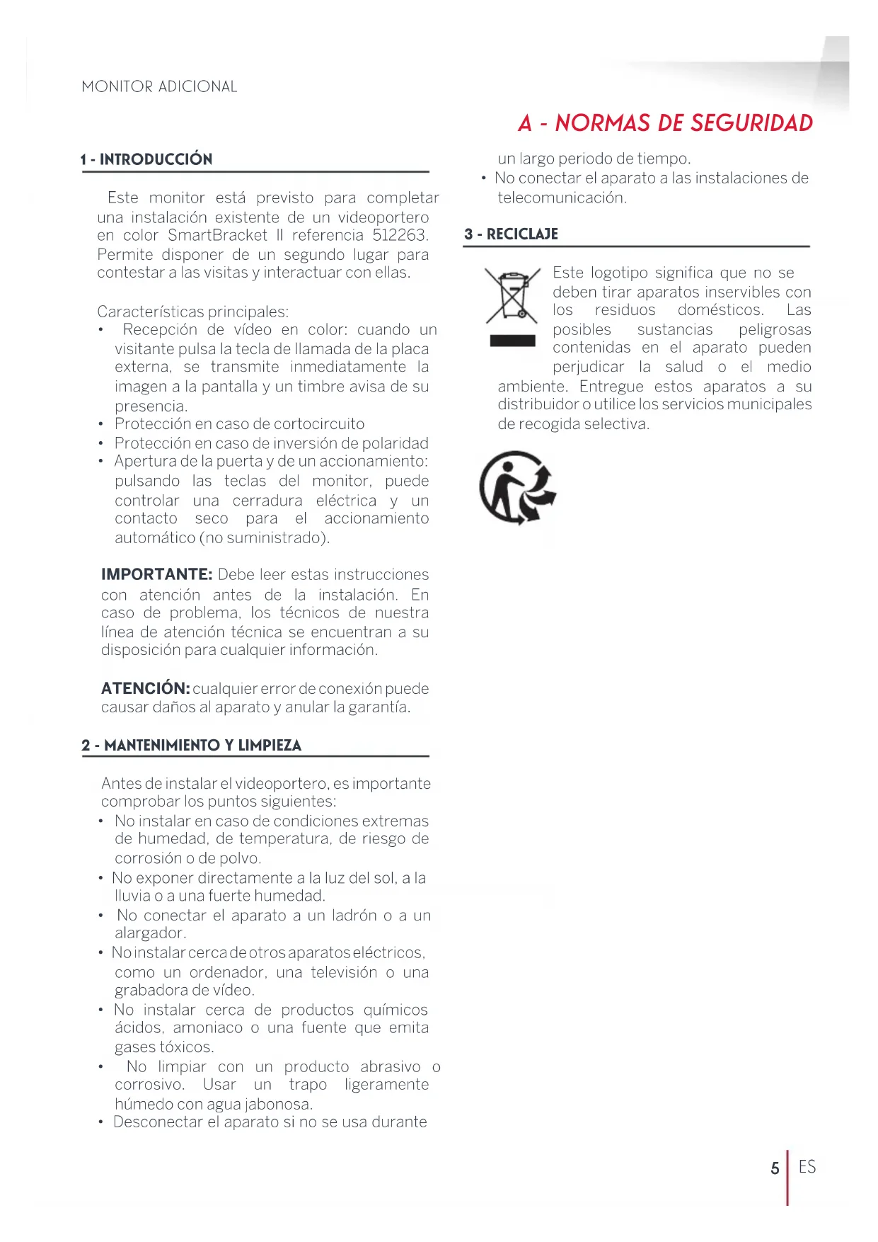 Para instalar y usar el monitor adicional, consulte las instrucciones del videoportero en color SmartBracket ll referencia 512263 para el cual el producto está previsto.9