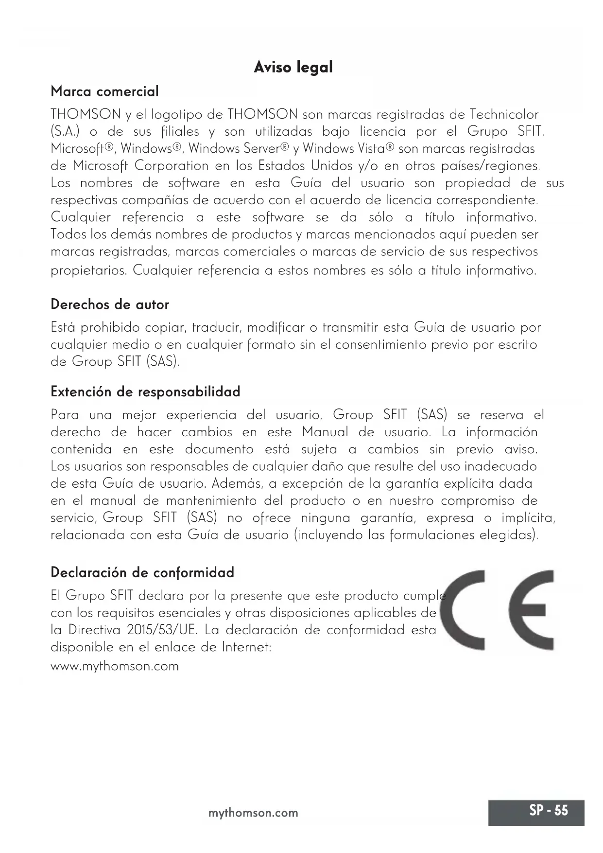mythomson.com Aviso legal Marca comercial THOMSON y el logotipo de THOMSON son marcas registradas de Technicolor (S.A.) o de sus liales y son utilizadas bajo licencia por el Grupo SFIT. Microsoft®, Windows®, Windows Server® y Windows Vista® son marcas registradas de Microsoft Corporation en los Estados Unidos y/o en otros países/regiones. Los nombres de software en esta Guía del usuario son propiedad de sus respectivas compañías de acuerdo con el acuerdo de licencia correspondiente. Cualquier referencia a este software se da sólo a título informativo. Todos los demás nombres de productos y marcas mencionados aquí pueden ser marcas registradas, marcas comerciales o marcas de servicio de sus respectivos propietarios. Cualquier referencia a estos nombres es sólo a título informativo. Derechos de autor Está prohibido copiar, traducir, modicar o transmitir esta Guía de usuario por cualquier medio o en cualquier formato sin el consentimiento previo por escrito de Group SFIT (SAS). Extención de responsabilidad Para una mejor experiencia del usuario, Group SFIT (SAS) se reserva el derecho de hacer cambios en este Manual de usuario. La información contenida en este documento está sujeta a cambios sin previo aviso. Los usuarios son responsables de cualquier daño que resulte del uso inadecuado de esta Guía de usuario. Además, a excepción de la garantía explícita dada en el manual de mantenimiento del producto o en nuestro compromiso de servicio, Group SFIT (SAS) no ofrece ninguna garantía, expresa o implícita, relacionada con esta Guía de usuario (incluyendo las formulaciones elegidas). Declaración de conformidad El Grupo SFIT declara por la presente que este producto cumple con los requisitos esenciales y otras disposiciones aplicables de la Directiva 2015/53/UE. La declaración de conformidad esta disponible en el enlace de Internet: www.mythomson.com56 - SP Manual de Usuario - Neo360 - 11.6’’ mythomson.com - Instrucciones importantes de seguridad - Esta unidad debe usarse en un ambiente con una temperatura ambiente entre 5°C (41°F) y 35°C (95°F). No exponga la unidad a la lluvia o la humedad y manténgala alejada de los líquidos. En caso de salpicaduras de agua u otro líquido sobre la unidad, apáguela inmediatamente y espere a que esté completamente seca antes de volver a encenderla. No exponga el aparato directamente a la radiación solar. No utilice disolventes fuertes, detergentes líquidos u otros productos químicos sobre o cerca de la supercie de la unidad para evitar la corrosión o el deterioro de la supercie de la unidad. No exponga la cámara a un entorno polvoriento. No utilice la unidad durante una fuga de gas. No exponga el dispositivo a campos magnéticos o eléctricos fuertes. Puede pasar el dispositivo por los detectores de rayos X del aeropuerto. Sin embargo, se recomienda no pasar el dispositivo por los portales de detección magnética ni exponerlo a detectores portátiles. No coloque ningún objeto sobre el dispositivo. No coloque la unidad sobre una supercie irregular o inestable. Asegúrese de proteger la unidad contra caídas o cualquier otro impacto que pueda dañarla. No deje el aparato puesto o cargado en su regazo o en cualquier otra parte de su cuerpo para evitar cualquier riesgo de lesiones relacionadas con el calor. Apague la unidad antes de transportarla o de cubrirla con un material que no permita una circulación óptima de aire. No utilice cables de alimentación, accesorios u otros dispositivos dañados con su dispositivo. Recomendamos el uso exclusivo de los accesorios (fuente de alimentación, cables, etc.) suministrados con la unidad.SP - 57 mythomson.com Utilice únicamente baterías originales. La sustitución de la batería por una batería incorrecta puede causar un riesgo de explosión. No desmonte, modique o repare la unidad usted mismo, ya que esto puede anular la garantía. Por favor, haga copias de seguridad de su contenido importante con regularidad para evitar la pérdida de datos. Nuestra empresa no se hace responsable de la pérdida o eliminación de los elementos contenidos en el dispositivo debido al uso inadecuado del hardware o software, a la falta de mantenimiento o a cualquier otro evento accidental. A plena potencia, prolongada escuchar el reproductor de música puede dañar el oído del usuario. Este producto ha sido diseñado para permitir el reciclaje adecuado de piezas y componentes. El símbolo que representa un contenedor de basura tachado indica que el dispositivo no debe desecharse con residuos municipales. Consulte la normativa local para la eliminación de aparatos electrónicos. El símbolo que representa un contenedor de basura tachado indica que la batería no debe desecharse con los residuos municipales. Consulte las regulaciones locales para la eliminación de baterías.58 - SP Manual de Usuario - Neo360 - 11.6’’ mythomson.com - Presentación del dispositivo - Vista frontal Nota : La presentación del dispositivo y algunas características pueden variar según el país, modelo o versión.