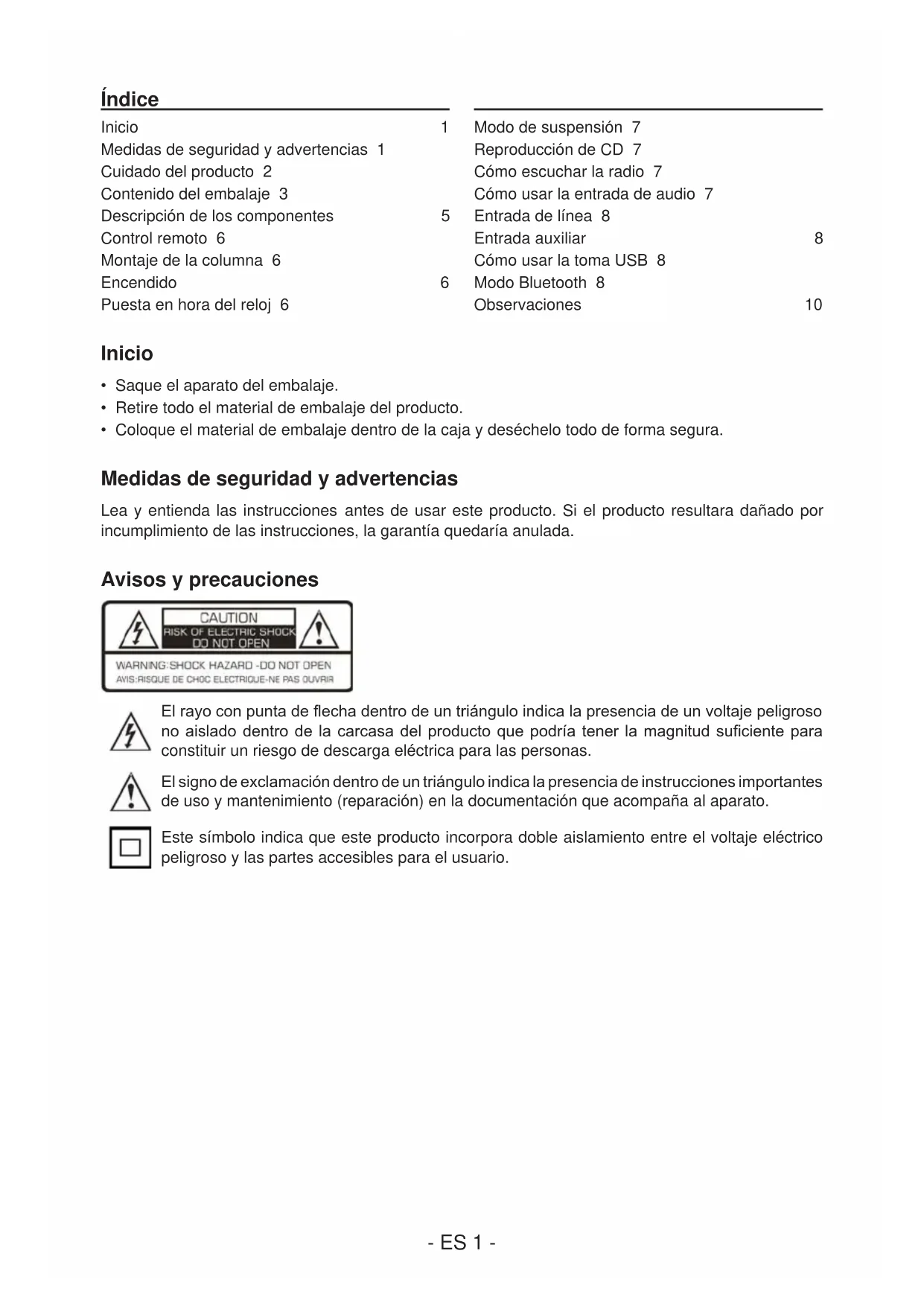 BBI_DS500_1508 _Ver2- ES 1 - Índice Inicio 1 Medidas de seguridad y advertencias 1 Cuidado del producto 2 Contenido del embalaje 3 Descripción de los componentes
