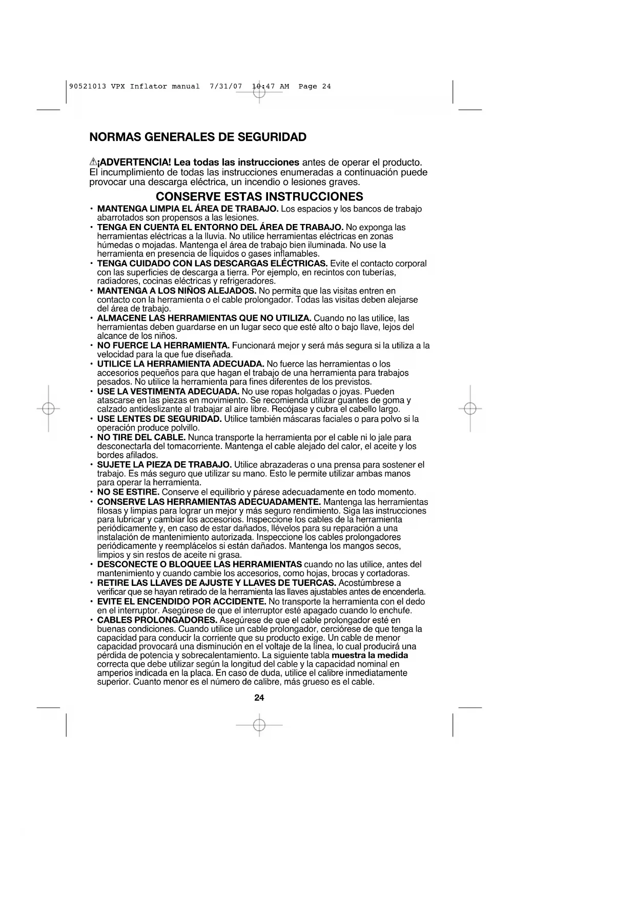 - CABLES PROLONGADORES. Asegúrese de que el cable prolongador esté en buenas condiciones. Cuando utilice un cable prolongador, cerciórese de que tenga la capacidad para conducir la corriente que su producto exige. Un cable de menor capacidad provocará una disminución en el voltaje de la línea, lo cual producirá una pérdida de potencia y sobrecalentamiento. La siguiente tabla muestra la medida correcta que debe utilizar según la longitud del cable y la capacidad nominal en amperios indicada en la placa. En caso de duda, utilice el calibre inmediatamente superior. Cuanto menor es el número de calibre, más grueso es el cable. 90521013 VPX Inflator manual 7/31/07 10:47 AM Page 2425