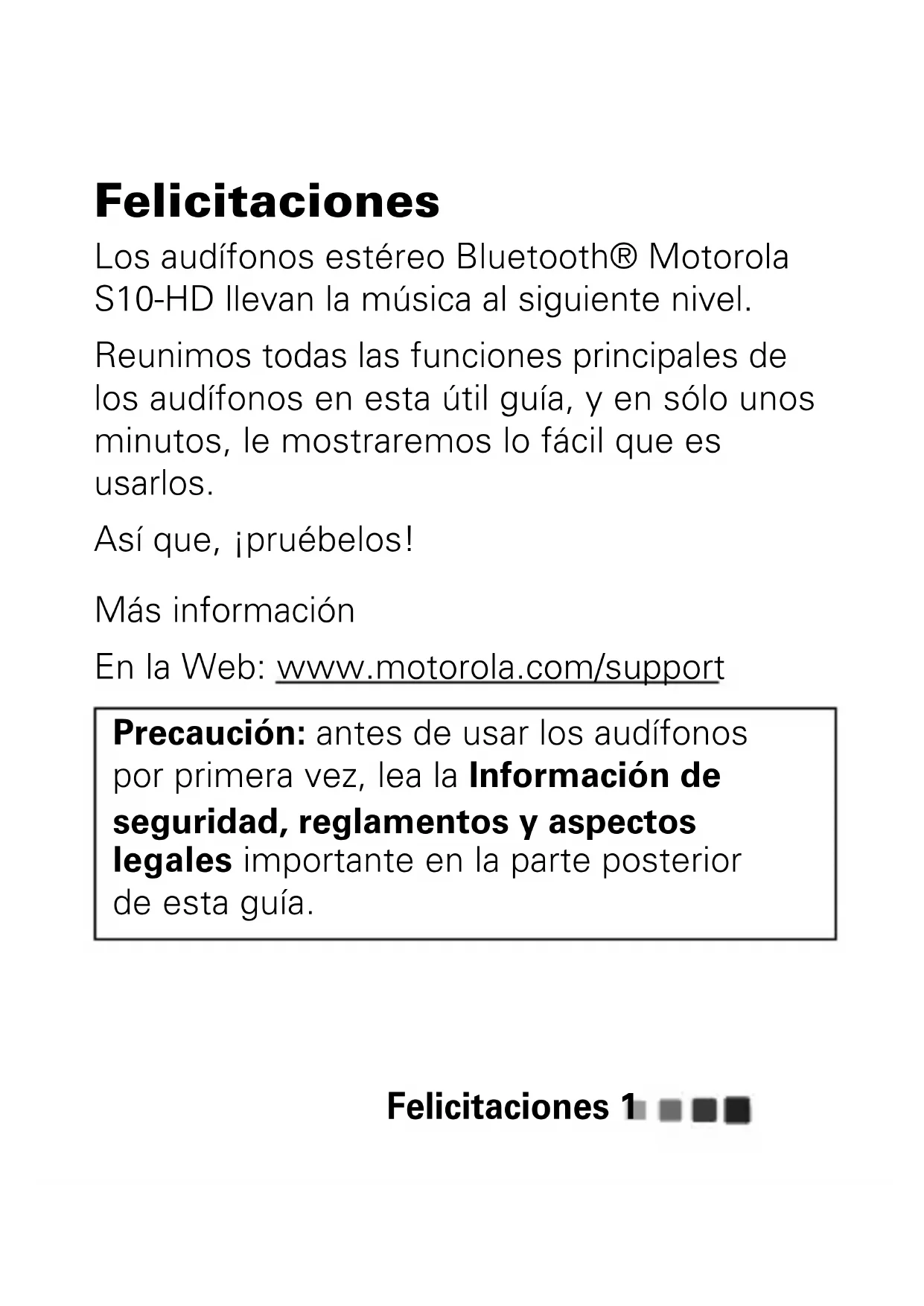 IMPORTANTE: leer las instrucciones antes de utilizar el producto.Felicitaciones 1 Felicitaciones Los audífonos estéreo Bluetooth® Motorola S10-HD llevan la música al siguiente nivel. Reunimos todas las funciones principales de los audífonos en esta útil guía, y en sólo unos minutos, le mostraremos lo fácil que es usarlos. Así que, ¡pruébelos! Más información En la Web: www.motorola.com/support Precaución: antes de usar los audífonos por primera vez, lea la Información de seguridad, reglamentos y aspectos legales importante en la parte posterior de esta guía.Los audífonos2 Los audífonos las piezas importantes Micrófono