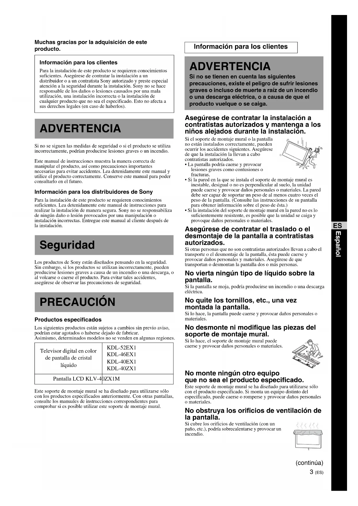 - Si la instalación del soporte de montaje mural en la pared no es lo suficientemente resistente, es posible que la unidad se caiga y provoque daños personales o materiales. Asegúrese de contratar el traslado o el desmontaje de la pantalla a contratistas autorizados. Si otras personas que no son contratistas autorizados llevan a cabo el transporte o el desmontaje de la pantalla, ésta puede caerse y provocar daños personales y materiales. Asegúrese de que transportan o desmontan la pantalla dos o más personas. No vierta ningún tipo de líquido sobre la pantalla. Si la pantalla se moja, podría producirse un incendio o una descarga eléctrica. No quite los tornillos, etc., una vez montada la pantalla. Si lo hace, la pantalla puede caerse y provocar daños personales o materiales. No desmonte ni modifique las piezas del soporte de montaje mural. Si lo hace, el soporte de montaje mural puede caerse y provocar daños personales o materiales. No monte ningún otro equipo que no sea el producto especificado. Este soporte de montaje mural se ha diseñado para utilizarse sólo con el producto especificado. Si monta un equipo distinto del especificado, puede caerse o romperse y provocar daños personales o materiales. No obstruya los orificios de ventilación de la pantalla. Si cubre los orificios de ventilación (con un paño, etc.), podría sobrecalentarse y provocar un incendio. Información para los clientes Para la instalación de este producto se requieren conocimientos suficientes. Asegúrese de contratar la instalación a un distribuidor o a un contratista Sony autorizado y preste especial atención a la seguridad durante la instalación. Sony no se hace responsable de los daños o lesiones causados por una mala utilización, una instalación incorrecta o la instalación de cualquier producto que no sea el especificado. Esto no afecta a sus derechos legales (en caso de haberlos). ADVERTENCIA Seguridad PRECAUCIÓN Televisor digital en color de pantalla de cristal líquido KDL-52EX1 KDL-46EX1 KDL-40EX1 KDL-40ZX1 Pantalla LCD KLV-40ZX1M ADVERTENCIA Si no se tienen en cuenta las siguientes precauciones, existe el peligro de sufrir lesiones graves o incluso de muerte a raíz de un incendio o una descarga eléctrica, o a causa de que el producto vuelque o se caiga. Información para los clientes