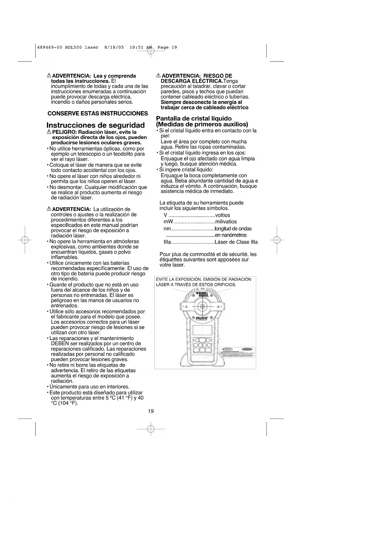 CUALQUIER RAZÓN, POR FAVOR LLAME AL (55)5326-7100 489469-00 BDL500 laser 8/18/05 10:51 AM Page 1819 ADVERTENCIA: Lea y comprenda todas las instrucciones. El incumplimiento de todas y cada una de las instrucciones enumeradas a continuación puede provocar descarga eléctrica, incendio o daños personales serios.