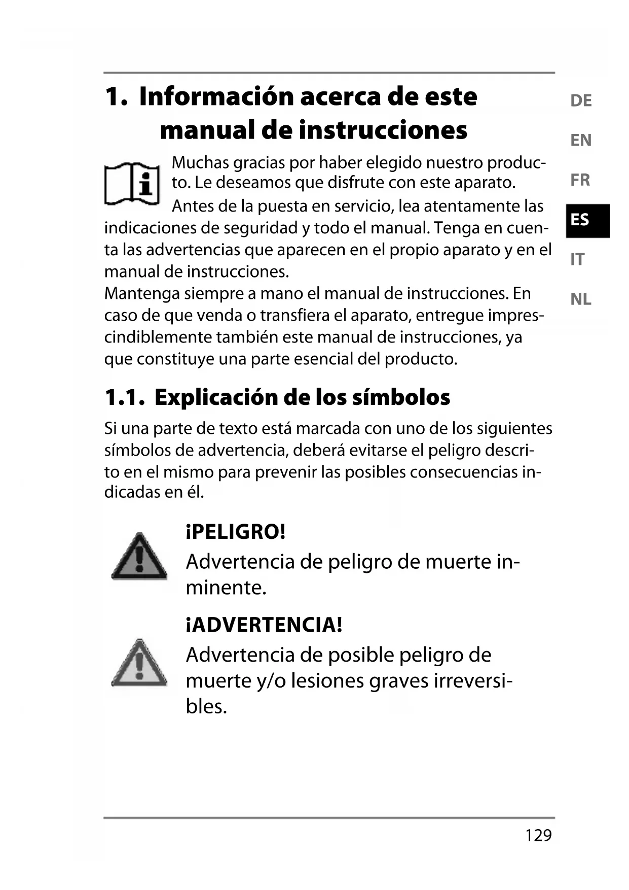 manual de instrucciones Muchas gracias por haber elegido nuestro produc- to. Le deseamos que disfrute con este aparato. Antes de la puesta en servicio, lea atentamente las indicaciones de seguridad y todo el manual. Tenga en cuen- ta las advertencias que aparecen en el propio aparato y en el manual de instrucciones. Mantenga siempre a mano el manual de instrucciones. En caso de que venda o transfiera el aparato, entregue impres- cindiblemente también este manual de instrucciones, ya que constituye una parte esencial del producto. 1.1. Explicación de los símbolos Si una parte de texto está marcada con uno de los siguientes símbolos de advertencia, deberá evitarse el peligro descri- to en el mismo para prevenir las posibles consecuencias in- dicadas en él. PELIGRO! Advertencia de peligro de muerte in- minente. ADVERTENCIA! Advertencia de posible peligro de muerte y/o lesiones graves irreversi- bles.130 ATENCIÓN! Advertencia de posibles lesiones de grado medio o leve. Información más detallada para el uso del apa- rato. ADVERTENCIA! Advertencia de peligro por descarga eléctrica.