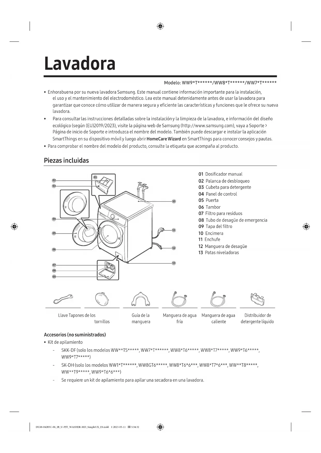 - Kit de apilamiento ‐ SKK-DF (solo los modelos WW**T5*****, WW7*T******, WW8*T6*****, WW8*T7*****, WW9*T6*****, WW9*T7*****) ‐ SK-DH (solo los modelos WW1*T******, WW8GT6*****, WW8*T6*6***, WW8*T7*6***, WW**T8*****, WW**T9*****, WW9*T6*6***) ‐ Se requiere un kit de apilamiento para apilar una secadora en una lavadora. DC68-04205C-06_IB_U-PJT_WASHER-MD_SimpleUX_ES.indd 1 2023-05-11 5:34:32Español2 Información de seguridad NOTA