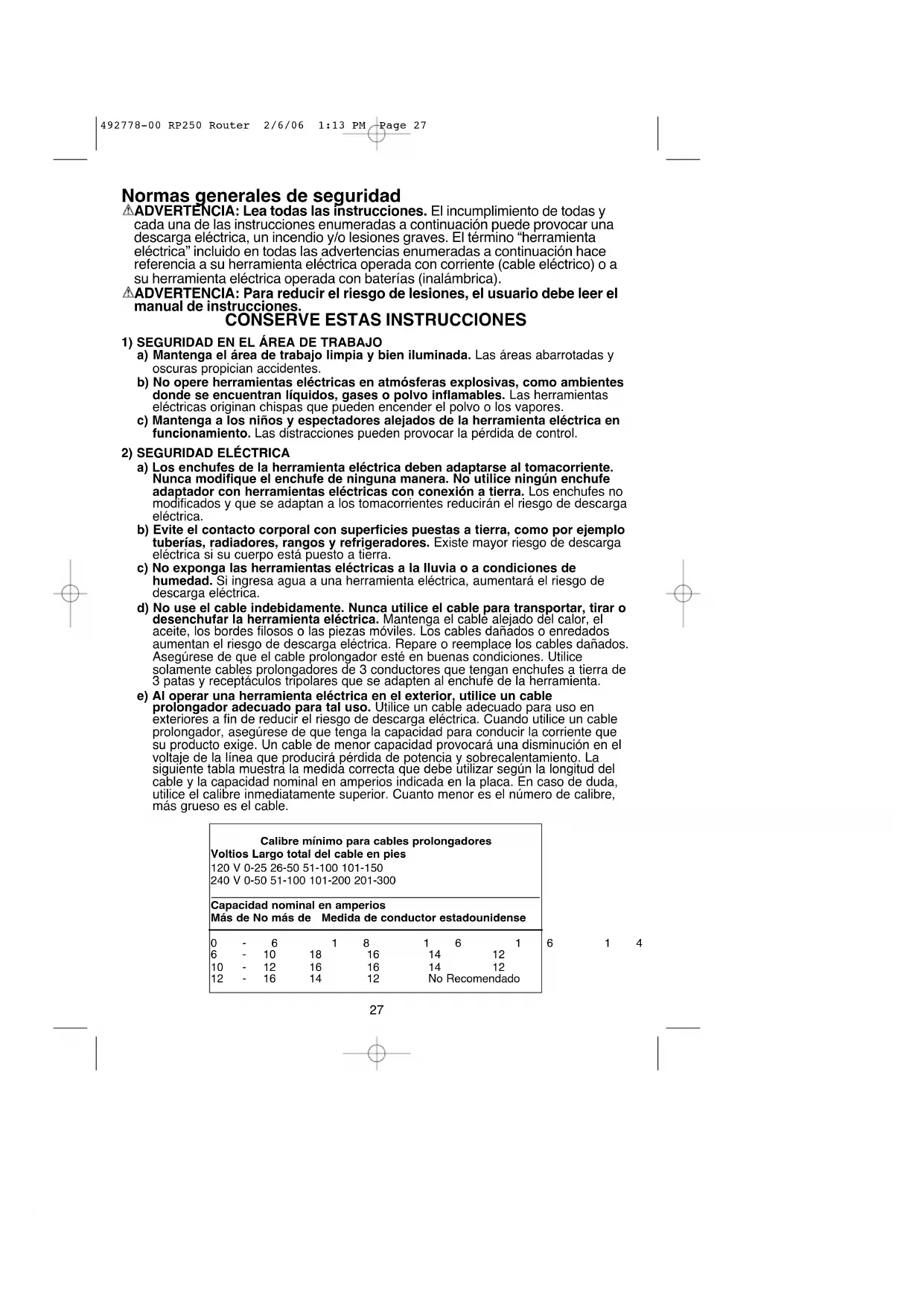 492778-00 RP250 Router 2/6/06 1:13 PM Page 2627 Normas generales de seguridad ADVERTENCIA: Lea todas las instrucciones. El incumplimiento de todas y cada una de las instrucciones enumeradas a continuación puede provocar una descarga eléctrica, un incendio y/o lesiones graves. El término “herramienta eléctrica” incluido en todas las advertencias enumeradas a continuación hace referencia a su herramienta eléctrica operada con corriente (cable eléctrico) o a su herramienta eléctrica operada con baterías (inalámbrica). ADVERTENCIA: Para reducir el riesgo de lesiones, el usuario debe leer el manual de instrucciones.