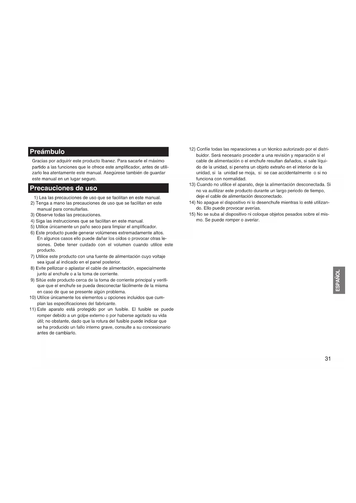 - Utiliceotrobajo,efectosocomponentesexternosycompruebesiseproduce el mismo ruido. En caso de defectos Este producto ha sido revisado exhaustivamente antes de salir de fábrica. Cuan- do piense que existe un problema, realice los procedimientos indicados más arri- ba. En el caso improbable de que se produjera alguna anomalía durante la utili- zación, póngase en contacto con su distribuidor. Además, cuando solicite reparaciones, explique con detalle los síntomas del problema para facilitar su rápida resolución. Debido a las mejoras de este producto, las especificaciones pueden cambiar sin previo aviso.38 ITALIANO Introduzione Grazie per aver acquistato questo prodotto Ibanez. Prima di usare l’amplificatore, leggere il manuale d’utilizzo attentamente in modo da ottenere la migliore funzionalità possibile. Conservare quindi il ma- nuale in un luogo sicuro. Precauzioni durante l’uso 1)Leggereleavvertenzecontenuteinquestomanualediistruzioni.