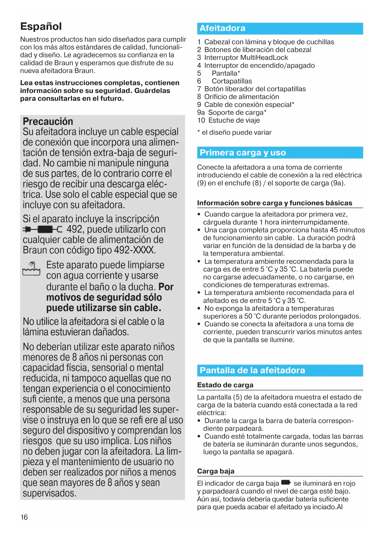 Le rasoir s’éteint alors que la batterie est complètement chargée. La grille et le bloc couteau (cassette) sont usés, ce qui requiert plus de puissance que le moteur n’est capable de fournir. L’appareil s’éteint. – Remplacez la grille et le bloc couteau. – Huilez régulièrement le système de rasage, spécialement lorsque vous nettoyez votre rasoir uniquement sous l’eau.16 Español Nuestros productos han sido diseñados para cumplir con los más altos estándares de calidad, funcionali- dad y diseño. Le agradecemos su confianza en la calidad de Braun y esperamos que disfrute de su nueva afeitadora Braun. Lea estas instrucciones completas, contienen información sobre su seguridad. Guárdelas para consultarlas en el futuro. Precaución Su afeitadora incluye un cable especial de conexión que incorpora una alimen- tación de tensión extra-baja de seguri- dad. No cambie ni manipule ninguna de sus partes, de lo contrario corre el riesgo de recibir una descarga eléc- trica. Use solo el cable especial que se incluye con su afeitadora. Si el aparato incluye la inscripción 492, puede utilizarlo con cualquier cable de alimentación de Braun con código tipo 492-XXXX. Este aparato puede limpiarse con agua corriente y usarse durante el baño o la ducha. Por motivos de seguridad sólo puede utilizarse sin cable. No utilice la afeitadora si el cable o la lámina estuvieran dañados. No deberían utilizar este aparato niños menores de 8 años ni personas con capacidad físcia, sensorial o mental reducida, ni tampoco aquellas que no tengan experiencia o el conocimiento sufi ciente, a menos que una persona responsable de su seguridad les super- vise o instruya en lo que se refi ere al uso seguro del dispositivo y comprendan los riesgos que su uso implica. Los niños no deben jugar con la afeitadora. La lim- pieza y el man tenimiento de usuario no deben ser realizados por niños a menos que sean mayores de 8 años y sean supervisados. Afeitadora 1 Cabezal con lámina y bloque de cuchillas 2 Botones de liberación del cabezal 3 Interruptor MultiHeadLock 4 Interruptor de encendido/apagado 5 Pantalla* 6 Cortapatillas 7 Botón liberador del cortapatillas 8 Orificio de alimentación 9 Cable de conexión especial* 9a Soporte de carga* 10 Estuche de viaje