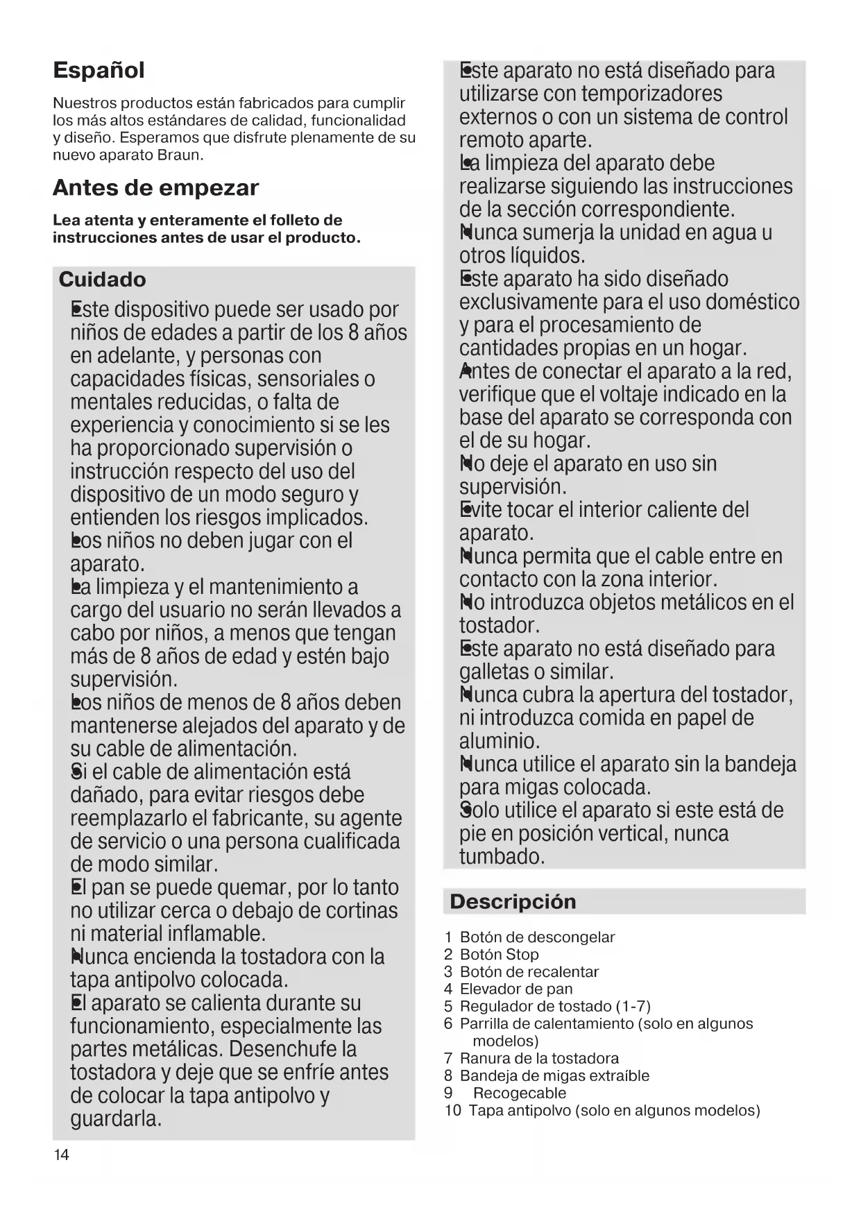 - Sortez de temps à autre le ramasse-miettes (8) et videz-le. 13Español Nuestros productos están fabricados para cumplir los más altos estándares de calidad, funcionalidad y diseño. Esperamos que disfrute plenamente de su nuevo aparato Braun. Antes de empezar Lea atenta y enteramente el folleto de instrucciones antes de usar el producto. Cuidado