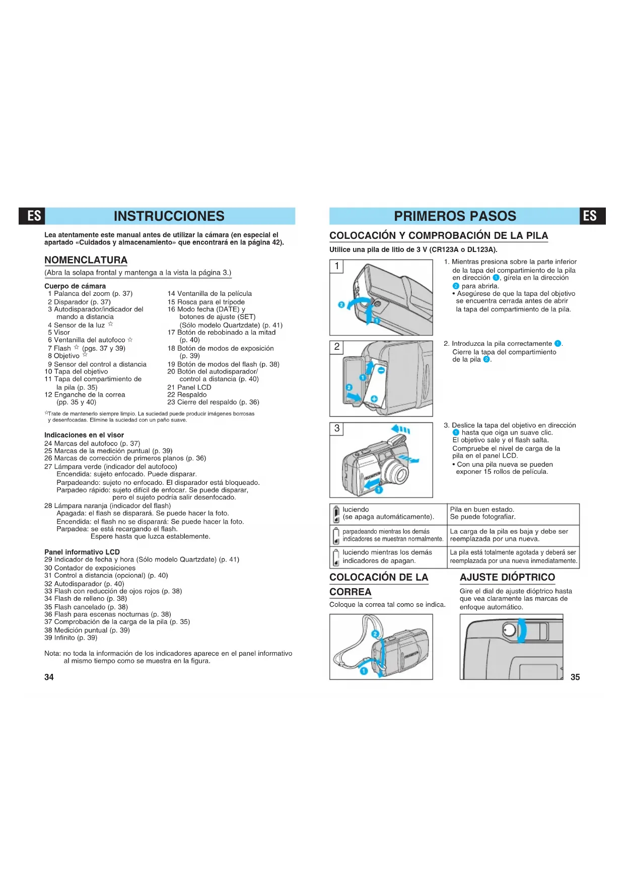 Trate de mantenerlo siempre limpio. La suciedad puede producir imágenes borrosas y desenfocadas. Elimine la suciedad con un paño suave. Indicaciones en el visor 24 Marcas del autofoco (p. 37) 25 Marcas de la medición puntual (p. 39) 26 Marcas de corrección de primeros planos (p. 36) 27 Lámpara verde (indicador del autofoco) Encendida: sujeto enfocado. Puede disparar. Parpadeando: sujeto no enfocado. El disparador está bloqueado. Parpadeo rápido: sujeto difícil de enfocar. Se puede disparar, pero el sujeto podría salir desenfocado. 28 Lámpara naranja (indicador del flash) Apagada: el flash se disparará. Se puede hacer la foto. Encendida: el flash no se disparará: Se puede hacer la foto. Parpadea: se está recargando el flash. Espere hasta que luzca establemente. Panel informativo LCD 29 Indicador de fecha y hora (Sólo modelo Quartzdate) (p. 41) 30 Contador de exposiciones 31 Control a distancia (opcional) (p. 40) 32 Autodisparador (p. 40) 33 Flash con reducción de ojos rojos (p. 38) 34 Flash de relleno (p. 38) 35 Flash cancelado (p. 38) 36 Flash para escenas nocturnas (p. 38) 37 Comprobación de la carga de la pila (p. 35) 38 Medición puntual (p. 39) 39 Infinito (p. 39) Nota: no toda la información de los indicadores aparece en el panel informativo al mismo tiempo como se muestra en la figura. 14 Ventanilla de la película 15 Rosca para el trípode 16 Modo fecha (DATE) y botones de ajuste (SET) (Sólo modelo Quartzdate) (p. 41) 17 Botón de rebobinado a la mitad (p. 40) 18 Botón de modos de exposición (p. 39) 19 Botón de modos del flash (p. 38) 20 Botón del autodisparador/ control a distancia (p. 40) 21 Panel LCD 22 Respaldo 23 Cierre del respaldo (p. 36)CÓMO HACER FOTOS