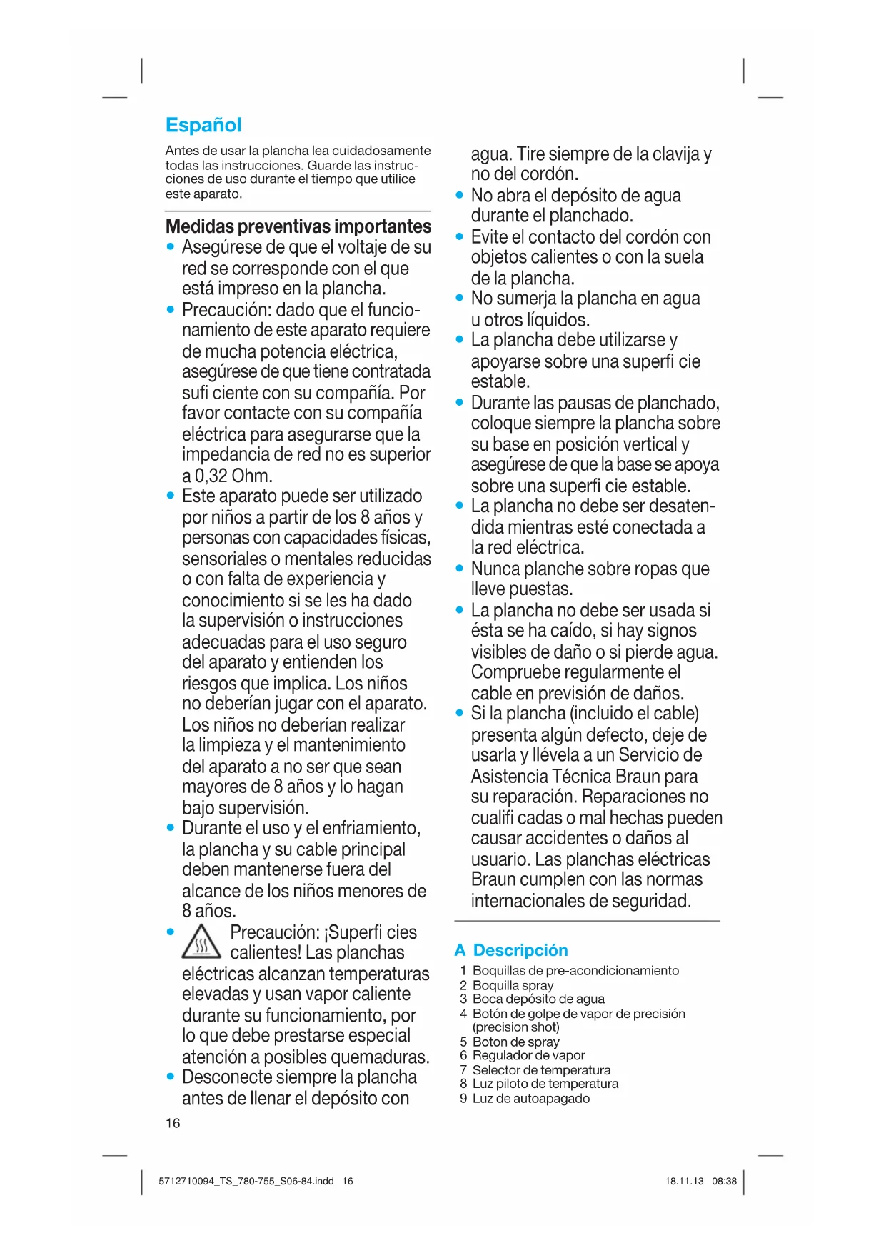 Si la plancha (incluido el cable) presenta algún defecto, deje de usarla y llévela a un Servicio de Asistencia Técnica Braun para su reparación. Reparaciones no cualifi cadas o mal hechas pueden causar accidentes o daños al usuario. Las planchas eléctricas Braun cumplen con las normas internacionales de seguridad. A Descripción 1 Boquillas de pre-acondicionamiento 2 Boquilla spray 3 Boca depósito de agua 4 Botón de golpe de vapor de precisión (precision shot) 5 Boton de spray 6 Regulador de vapor 7 Selector de temperatura 8 Luz piloto de temperatura 9 Luz de autoapagado 5712710094_TS_780-755_S06-84.indd 165712710094_TS_780-755_S06-84.indd 16 18.11.13 08:3818.11.13 08:3817 10 Base de apoyo 11 Suela protectora para tejidos delicados (Textile Protector) 12 Suela protectora para tejidos delicados (Soft Textile Protector) B Antes de empezar Esta plancha está diseñada para utilizar agua del grifo. Si el agua es muy dura, recomendamos utilizar una mezcla de 50 % de agua del grifo y 50 % de agua destilada. Llene el depósito de agua hasta la señal «max». No use agua destilada únicamente. No añada aditivos (por ejem- plo, almidón). No utilizar agua proveniente de las secadoras.