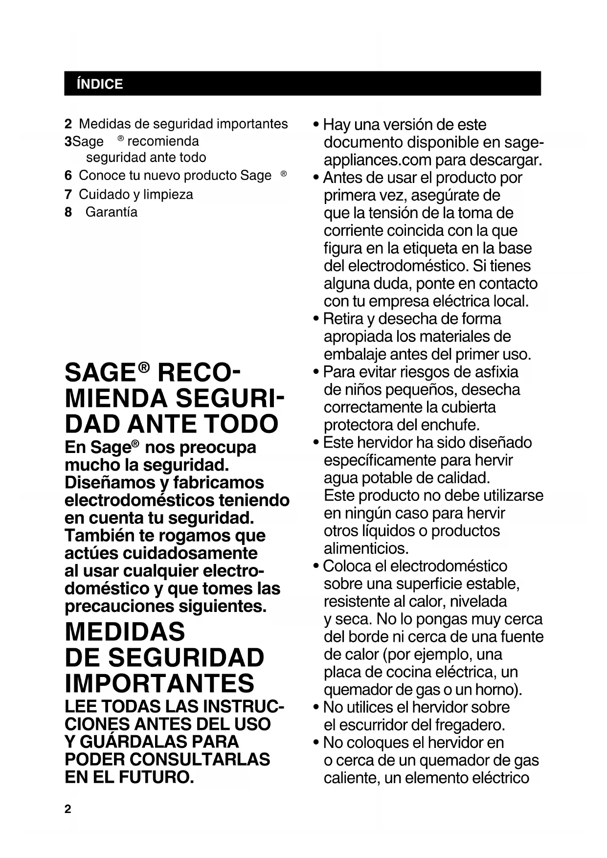 - No coloques el hervidor en o cerca de un quemador de gas caliente, un elemento eléctrico 2 Medidas de seguridad importantes 3 Sage
