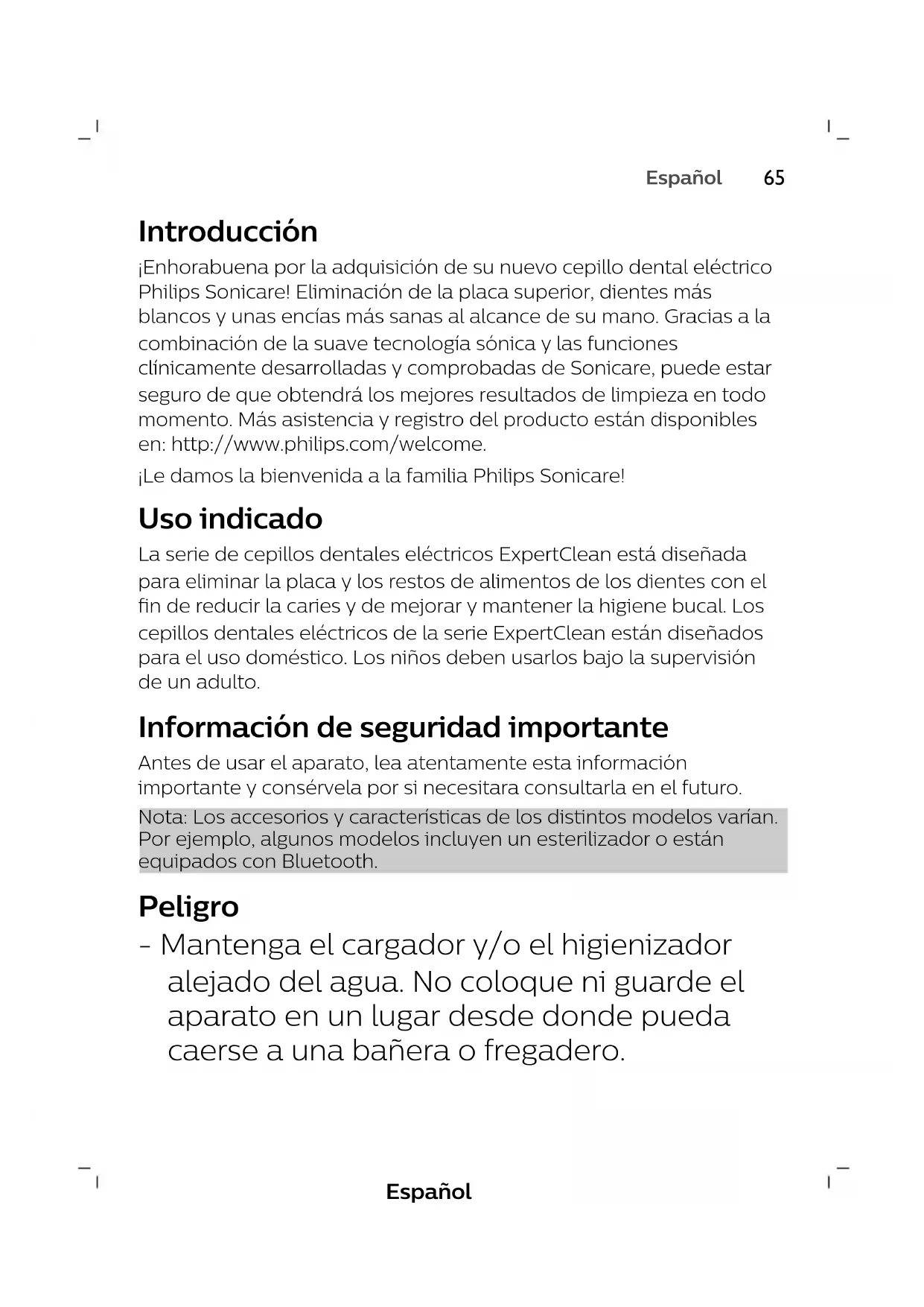 DeutschEspañol Introducción ¡Enhorabuena por la adquisición de su nuevo cepillo dental eléctrico Philips Sonicare! Eliminación de la placa superior, dientes más blancos y unas encías más sanas al alcance de su mano. Gracias a la combinación de la suave tecnología sónica y las funciones clínicamente desarrolladas y comprobadas de Sonicare, puede estar seguro de que obtendrá los mejores resultados de limpieza en todo momento. Más asistencia y registro del producto están disponibles en: http://www.philips.com/welcome. ¡Le damos la bienvenida a la familia Philips Sonicare! Uso indicado La serie de cepillos dentales eléctricos ExpertClean está diseñada para eliminar la placa y los restos de alimentos de los dientes con el fin de reducir la caries y de mejorar y mantener la higiene bucal. Los cepillos dentales eléctricos de la serie ExpertClean están diseñados para el uso doméstico. Los niños deben usarlos bajo la supervisión de un adulto. Información de seguridad importante Antes de usar el aparato, lea atentamente esta información importante y consérvela por si necesitara consultarla en el futuro. Nota: Los accesorios y características de los distintos modelos varían. Por ejemplo, algunos modelos incluyen un esterilizador o están equipados con Bluetooth. Peligro - Mantenga el cargador y/o el higienizador alejado del agua. No coloque ni guarde el aparato en un lugar desde donde pueda caerse a una bañera o fregadero.