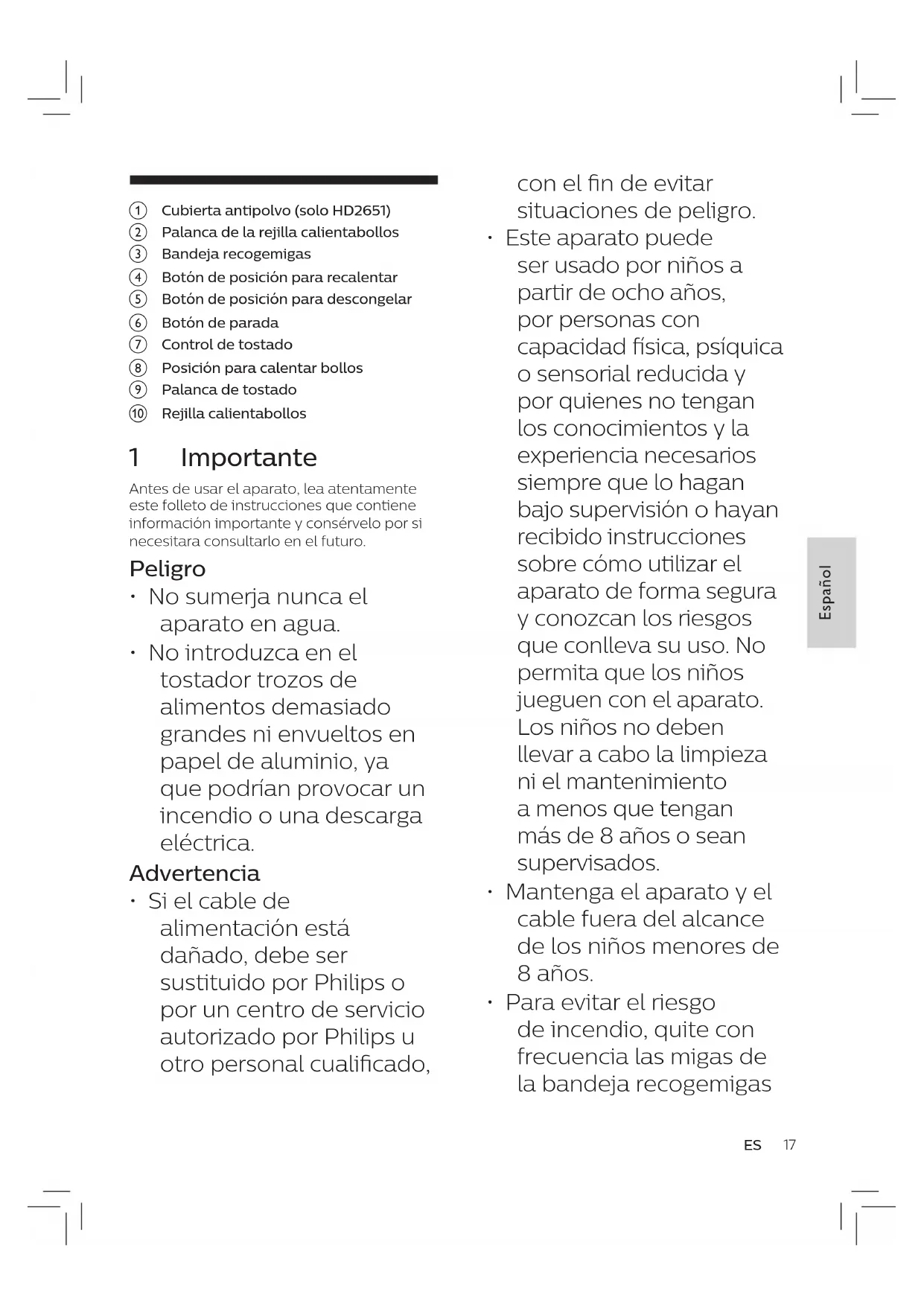 - Para evitar el riesgo de incendio, quite con frecuencia las migas de la bandeja recogemigas a Cubierta antipolvo (solo HD2651) b Palanca de la rejilla calientabollos c Bandeja recogemigas d Botón de posición para recalentar e Botón de posición para descongelar f Botón de parada g Control de tostado h Posición para calentar bollos i Palanca de tostado j Rejilla calientabollos 1 Importante Antes de usar el aparato, lea atentamente este folleto de instrucciones que contiene información importante y consérvelo por si necesitara consultarlo en el futuro. Peligro