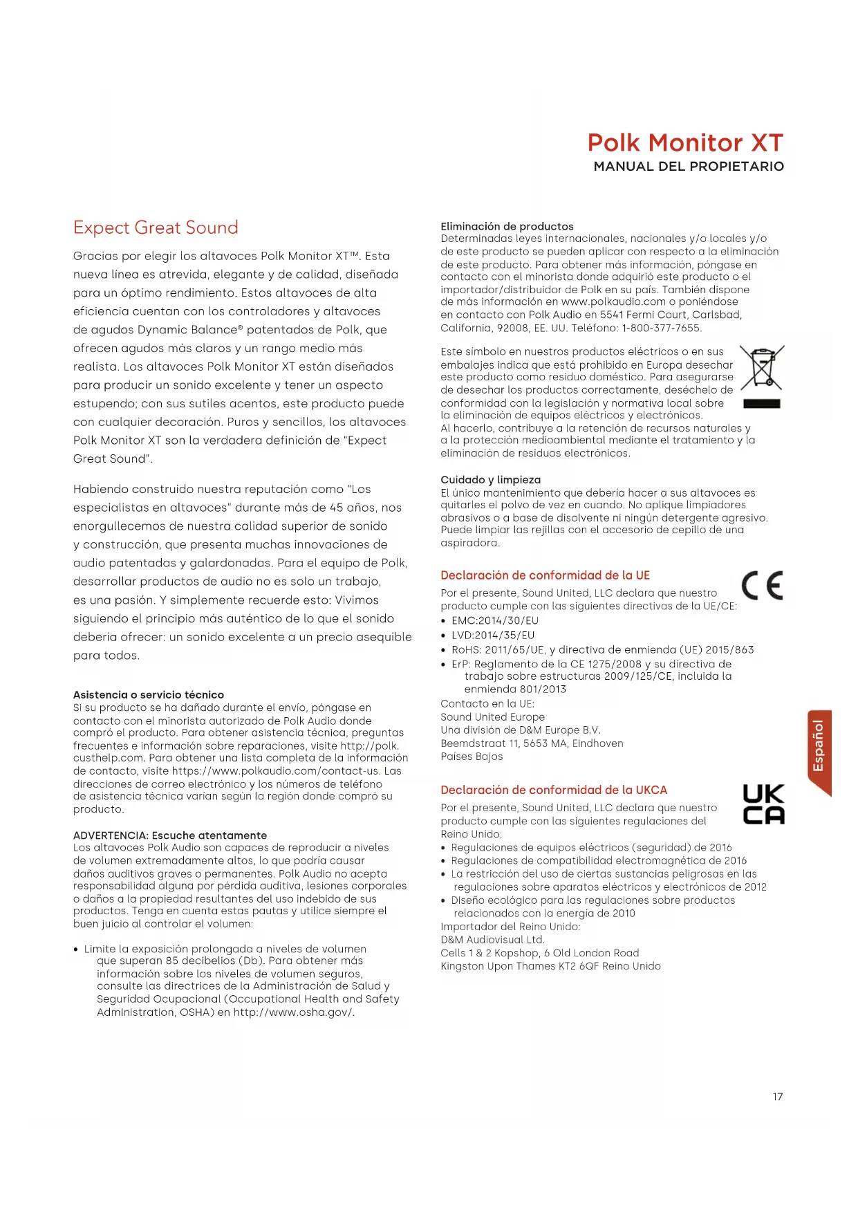 - Limite la exposición prolongada a niveles de volumen que superan 85 decibelios (Db). Para obtener más información sobre los niveles de volumen seguros, consulte las directrices de la Administración de Salud y Seguridad Ocupacional (Occupational Health and Safety Administration, OSHA) en http://www.osha.gov/. Eliminación de productos Determinadas leyes internacionales, nacionales y/o locales y/o de este producto se pueden aplicar con respecto a la eliminación de este producto. Para obtener más información, póngase en contacto con el minorista donde adquirió este producto o el importador/distribuidor de Polk en su país. También dispone de más información en www.polkaudio.com o poniéndose en contacto con Polk Audio en 5541 Fermi Court, Carlsbad, California, 92008, EE. UU. Teléfono: 1-800-377-7655. Este símbolo en nuestros productos eléctricos o en sus embalajes indica que está prohibido en Europa desechar este producto como residuo doméstico. Para asegurarse de desechar los productos correctamente, deséchelo de conformidad con la legislación y normativa local sobre la eliminación de equipos eléctricos y electrónicos. Al hacerlo, contribuye a la retención de recursos naturales y a la protección medioambiental mediante el tratamiento y la eliminación de residuos electrónicos. Cuidado y limpieza El único mantenimiento que debería hacer a sus altavoces es quitarles el polvo de vez en cuando. No aplique limpiadores abrasivos o a base de disolvente ni ningún detergente agresivo. Puede limpiar las rejillas con el accesorio de cepillo de una aspiradora. Declaración de conformidad de la UE Por el presente, Sound United, LLC declara que nuestro producto cumple con las siguientes directivas de la UE/CE: