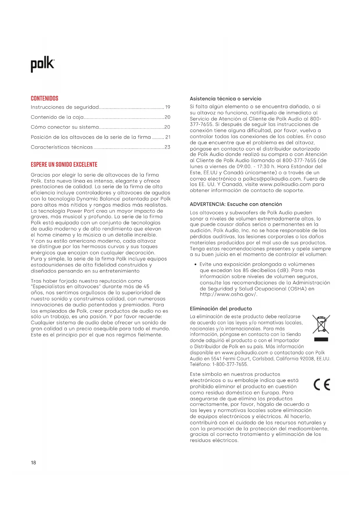 - Evite una exposición prolongada a volúmenes que excedan los 85 decibelios (dB). Para más información sobre niveles de volumen seguros, consulte las recomendaciones de la Administración de Seguridad y Salud Ocupacional (OSHA) en http://www.osha.gov/. Eliminación del producto La eliminación de este producto debe realizarse de acuerdo con las leyes y/o normativas locales, nacionales y/o internacionales. Para más información, póngase en contacto con la tienda donde adquirió el producto o con el Importador o Distribuidor de Polk en su país. Más información disponible en www.polkaudio.com o contactando con Polk Audio en 5541 Fermi Court, Carlsbad, California 92008, EE.UU. Teléfono: 1-800-377-7655. Este símbolo en nuestros productos electrónicos o su embalaje indica que está prohibido eliminar el producto en cuestión como residuo doméstico en Europa. Para asegurarse de que elimina los productos correctamente, por favor, hágalo de acuerdo a las leyes y normativas locales sobre eliminación de equipos electrónicos y eléctricos. Al hacerlo, contribuirá con el cuidado de los recursos naturales y con la promoción de la protección del medioambiente, gracias al correcto tratamiento y eliminación de los residuos eléctricos. Contenidos Instrucciones de seguridad ................................................ 19 Contenido de la caja ........................................................... 20 Cómo conectar su sistema................................................20 Posición de los altavoces de la serie de la firma ......... 21 Características técnicas ....................................................23
