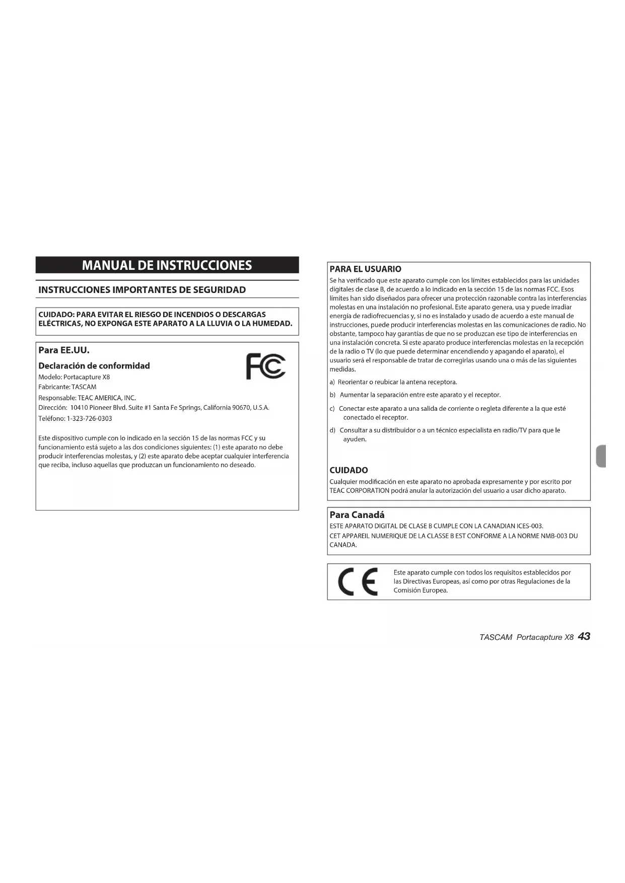 CUIDADO: PARA EVITAR EL RIESGO DE INCENDIOS O DESCARGAS ELÉCTRICAS, NO EXPONGA ESTE APARATO A LA LLUVIA O LA HUMEDAD. Para EE.UU. Declaración de conformidad Modelo: Portacapture X8Fabricante: TASCAMResponsable: TEAC AMERICA, INC.Dirección: 10410 Pioneer Blvd. Suite #1 Santa Fe Springs, California 90670, U.S.A.Teléfono: 1-323-726-0303Este dispositivo cumple con lo indicado en la sección 15 de las normas FCC y su funcionamiento está sujeto a las dos condiciones siguientes: (1) este aparato no debe producir interferencias molestas, y (2) este aparato debe aceptar cualquier interferencia que reciba, incluso aquellas que produzcan un funcionamiento no deseado.