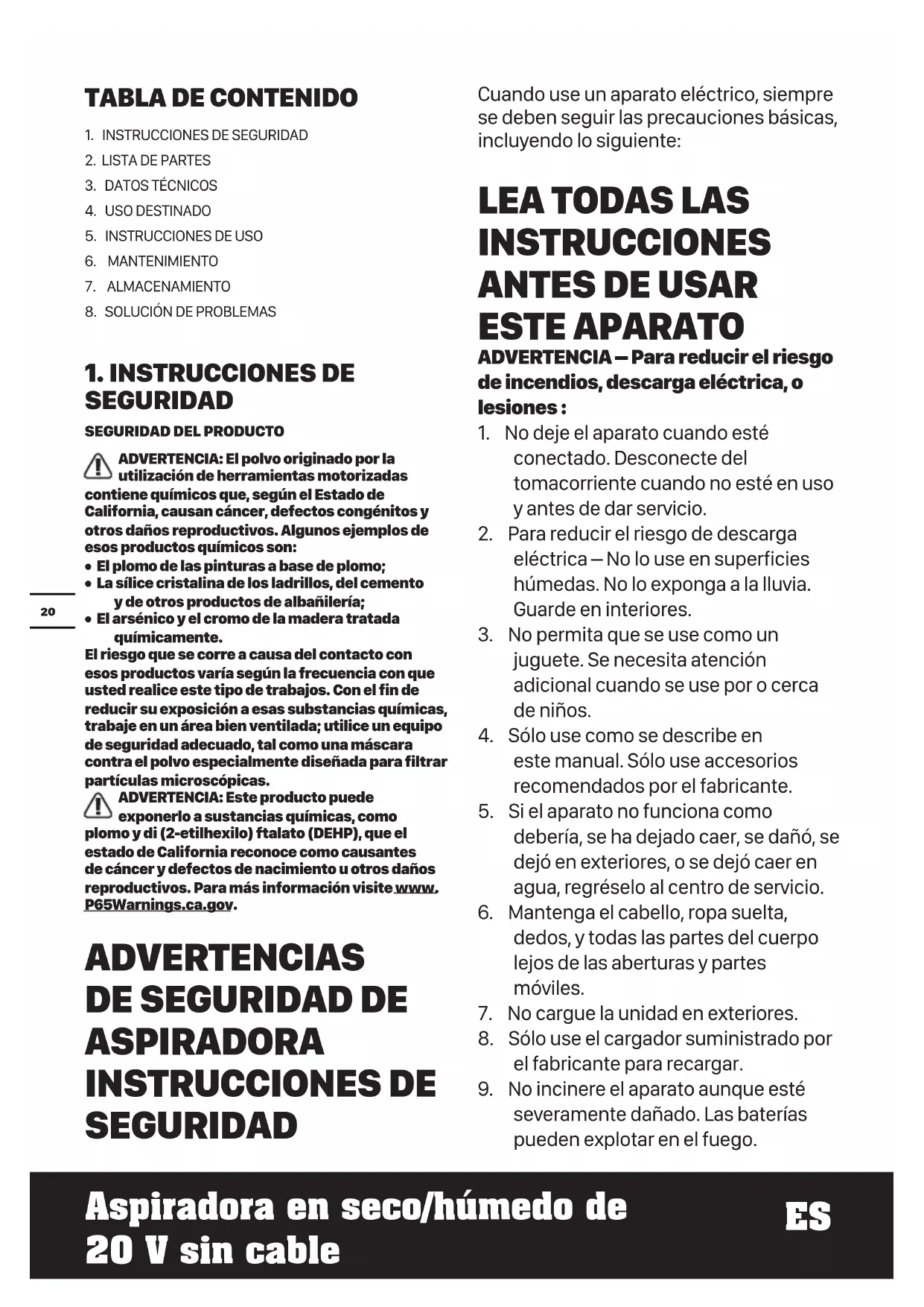 1. INSTRUCCIONES DE SEGURIDAD2. LISTA DE PARTES3. DATOS TÉCNICOS4. USO DESTINADO5. INSTRUCCIONES DE USO6. MANTENIMIENTO7. ALMACENAMIENTO8. SOLUCIÓN DE PROBLEMAS