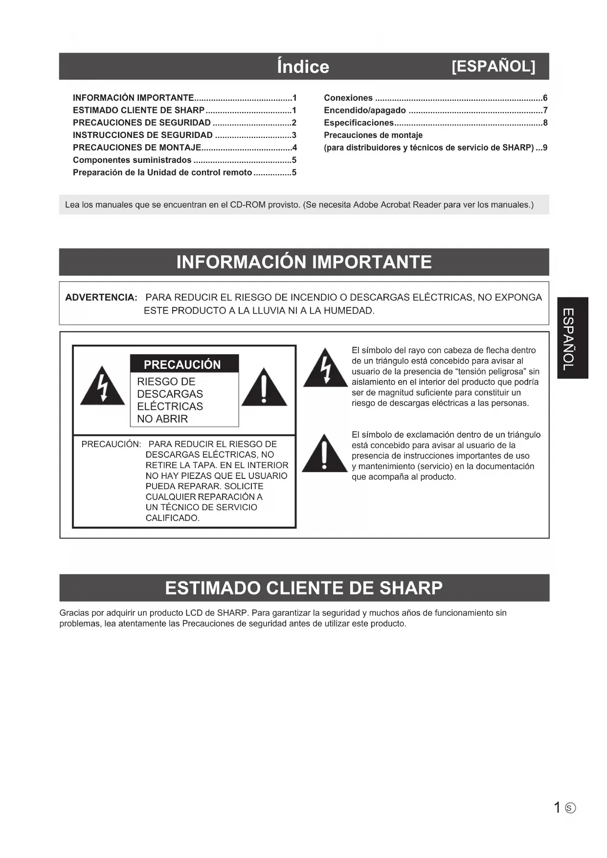 ADVERTENCIA: PARA REDUCIR EL RIESGO DE INCENDIO O DESCARGAS ELÉCTRICAS, NO EXPONGA ESTE PRODUCTO A LA LLUVIA NI A LA HUMEDAD.Gracias por adquirir un producto LCD de SHARP. Para garantizar la seguridad y muchos años de funcionamiento sin problemas, lea atentamente las Precauciones de seguridad antes de utilizar este producto.