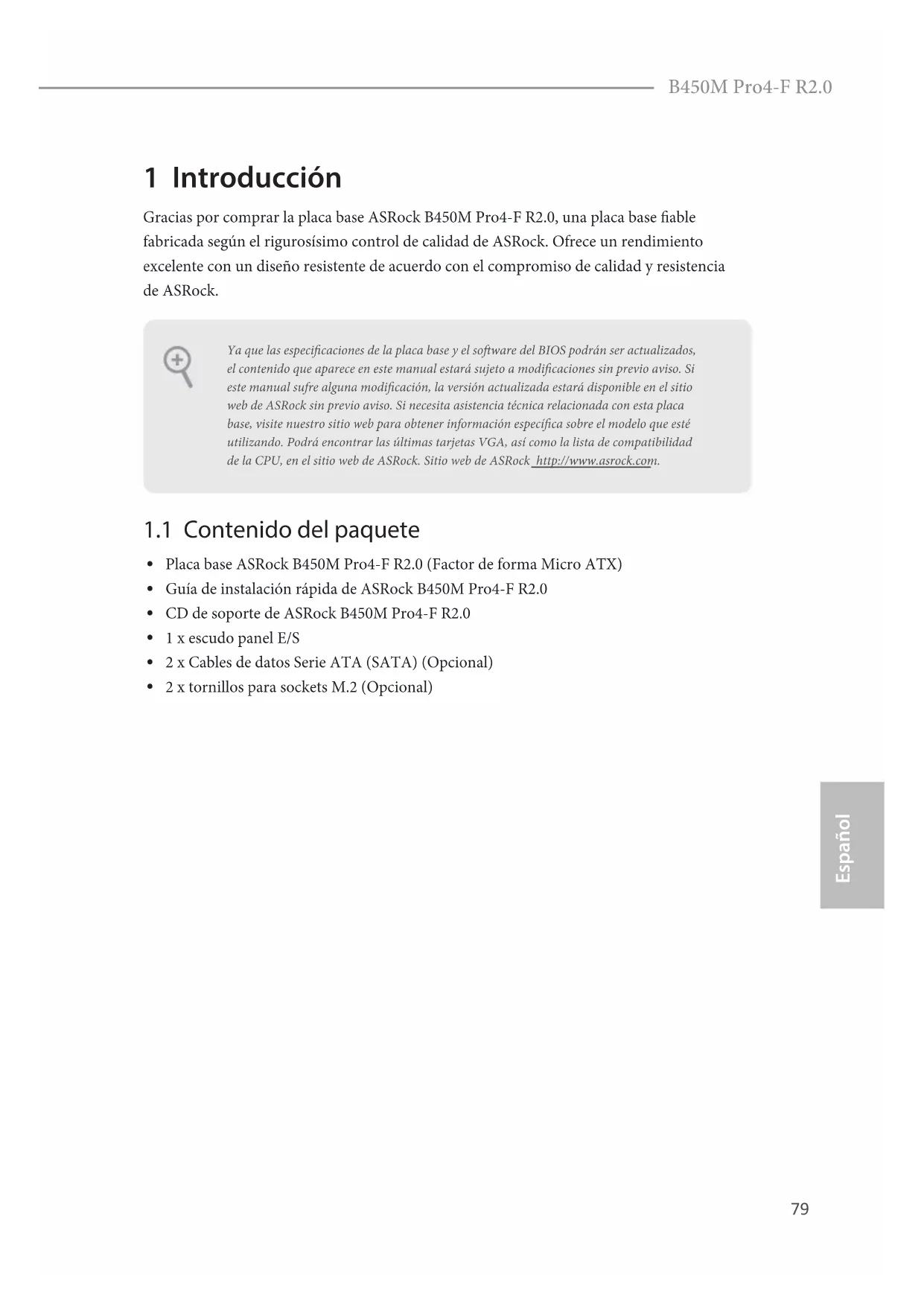 Español B450M Pro4-F R2.0 1 Introducción Gracias por comprar la placa base ASRock B450M Pro4-F R2.0, una placa base able fabricada según el rigurosísimo control de calidad de ASRock. Ofrece un rendimiento excelente con un diseño resistente de acuerdo con el compromiso de calidad y resistencia de ASRock.