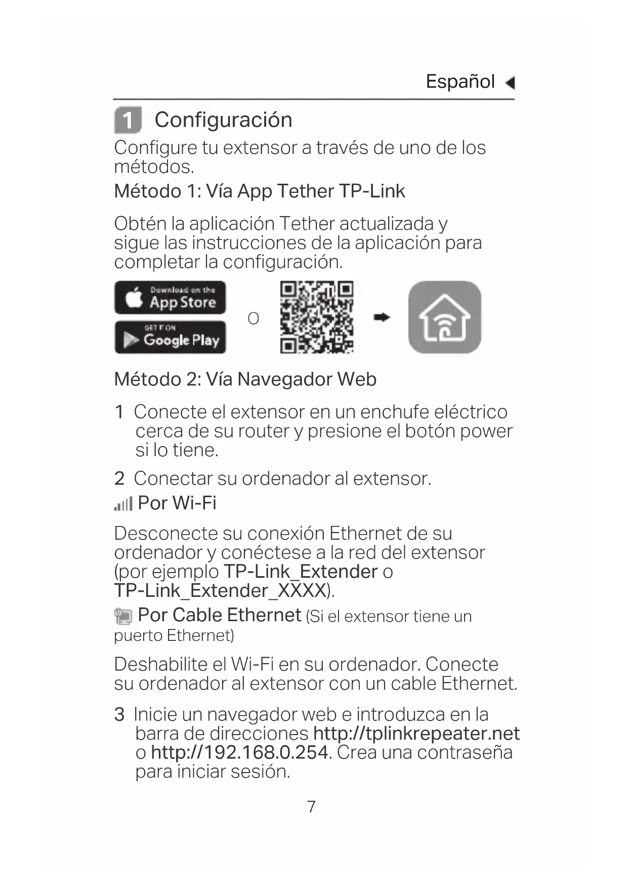 Configuración Configure tu extensor a través de uno de los métodos. Método 1: Vía App Tether TP-Link Obtén la aplicación Tether actualizada y sigue las instrucciones de la aplicación para completar la configuración. Método 2: Vía Navegador Web 1 Conecte el extensor en un enchufe eléctrico cerca de su router y presione el botón power si lo tiene. 2 Conectar su ordenador al extensor. Por Wi-Fi Desconecte su conexión Ethernet de su ordenador y conéctese a la red del extensor (por ejemplo TP-Link_Extender o TP-Link_Extender_XXXX). Por Cable Ethernet (Si el extensor tiene un puerto Ethernet) Deshabilite el Wi-Fi en su ordenador. Conecte su ordenador al extensor con un cable Ethernet. 3 Inicie un navegador web e introduzca en la barra de direcciones http://tplinkrepeater.net o http://192.168.0.254. Crea una contraseña para iniciar sesión. OEspañol