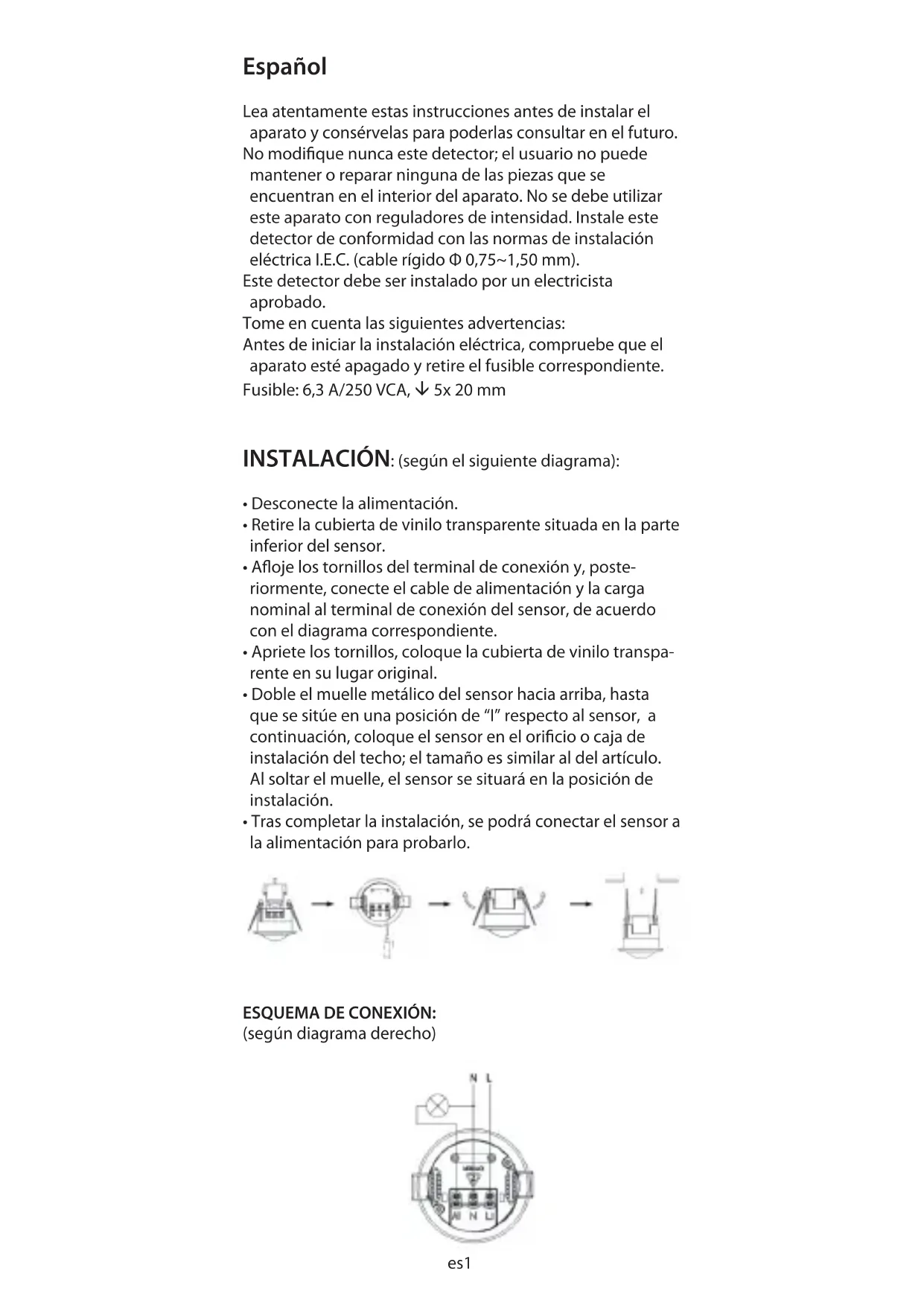 - Trascompletarlainstalación,sepodráconectarelsensora laalimentaciónparaprobarlo. ESQUEMA DE CONEXIÓN: (segúndiagramaderecho) es1TEST: Cuando la corriente se restablece, el detector PIR 360° va re enunafasedeinicializaciónduranteaproximadamente30 segundos (dentro de 1 minuto) y después de estos plazos, eldetectorpasaráentoncesautomáticamenteenmétodo dedetección.Unavezenmétododedetecciónpodrán entonces probar su detector; regule el control de luminosi- dadLUXsobrelaposición()ylacontemporización TIME como mínimo sobre (-). En cuanto un movimiento seencuentraenloscamposdedetección,lalámparavaa encenderseduranteunaduraciónprerregulada.Podrán determinarloscamposdedetecciónenustedesdesplaza- miento suavemente. Despuésdeunapruebacompletadedetección,regulan progresivamente: -LaluminosidadLUXhacialaposicióndañaconelnde garantizarqueladetecciónsehaceenlaoscuridad. -LacontemporizaciónTIMEporelperíododetiempode alumbrado deseado. REGLAGE DEL NIVEL DE LUMINOSIDAD LUX: Elmódulodecontroldeluminosidad(CdSphotocell) detectalaclaridadylaoscuridad.Laposición() permite ladetecciónduranteeldíaylanoche. Laposición()permiteladetecciónsolamentelanoche. Pueden regularladetecciónparaelniveldeluminosidaddeseado ajustando el cursor LUX. REGLAGE DE LA CONTEMPORIZACIÓN: Lacontemporizaciónes:«laduracióndurantelacualla lámparapermaneceencendidadespuésdeladetección». Laduracióndeactivaciónesajustablede±10segundos a±5minutos.AjustanelcursorTIMEdelaposición(+) hacialaposición(-)conelndeaumentareltiempode activación. Nota:Unavezquelalámparaseenciendearaízdeuna deteccióncualquierotrodetecciónreinicializarála contemporizacióndesdeelprincipio. ESPECIFICACIONES: Fuentedealimentación:220V/CA-240V/CA Campodedetección:360º Frecuenciadealimentación:50Hz Temperatura operativa: -20~+40°C Luz ambiental:3-2000LUX (ajustable) Humedad relativa: <93%HR Retrasodetiempo:mín:10seg±3segmáx:7min±2min es2Alturadeinstalación:2.2m~4m Consumo de energía: 0,45W (trabajo) Carga nominal: 1.200W (bombilla incandescente) 0,1W(estático)300W(bombilladeahorrodeenergía) Velocidaddemovimientodedetección:0,6~1,5m/s Distanciadedetección:6mmáx(<24°C) HOT LINE hotline@chacon.be Website:www.chacon.be es3Português Leia atentamente este aviso antes de qualquer instalação e conserve-o para referência futura. Nunca modique este detector; o utilizador não pode efectuar a manutenção ou reparação de qualquer peça queseencontrenointeriordoaparelho.Esteaparelhonão deve ser utilizado com variadores de intensidade.Instale este detector de acordo com as normas da I.E.C (cabo rígido Ф 0,75~1,50 mm). Este detector deve ser instalado por um electricista certicado. Tenhaematençãoasseguintesobservações: 1.Antesdeiniciarqualquerinstalaçãoeléctrica,aconselha- mo-lo vivamente a desligar o disjuntor geral de todas as suasinstalaçõeseléctricas(paraquenãocorraqualquer risco de electrocussão).