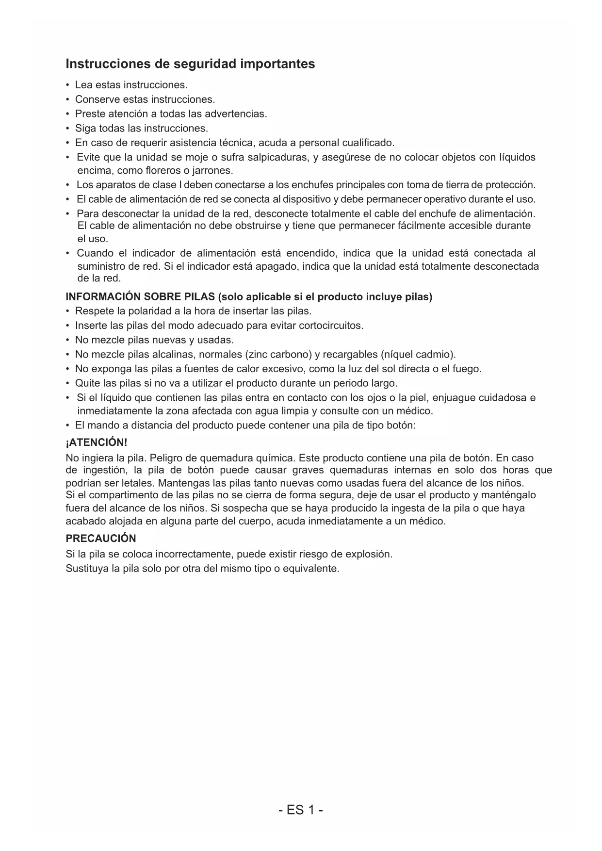 - El mando a distancia del producto puede contener una pila de tipo botón: ¡ATENCIÓN! No ingiera la pila. Peligro de quemadura química. Este producto contiene una pila de botón. En caso de ingestión, la pila de botón puede causar graves quemaduras internas en solo dos horas que podrían ser letales. Mantengas las pilas tanto nuevas como usadas fuera del alcance de los niños. Si el compartimento de las pilas no se cierra de forma segura, deje de usar el producto y manténgalo fuera del alcance de los niños. Si sospecha que se haya producido la ingesta de la pila o que haya acabado alojada en alguna parte del cuerpo, acuda inmediatamente a un médico. PRECAUCIÓN Si la pila se coloca incorrectamente, puede existir riesgo de explosión. Sustituya la pila solo por otra del mismo tipo o equivalente.- ES 2 -