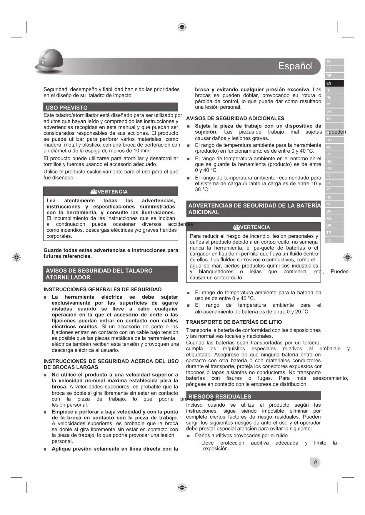 Transporte la batería de conformidad con las disposiciones y las normativas locales y nacionales. Cuando las baterías sean transportadas por un tercero, FXPSOD ORV UHTXLVLWRV HVSHFLDOHV UHODWLYRV DO HPEDODMH \ etiquetado. Asegúrese de que ninguna batería entra en contacto con otra batería o con materiales conductores GXUDQWHHOWUDQVSRUWHSURWHMDORVFRQHFWRUHVH[SXHVWRVFRQ tapones o tapas aislantes no conductoras. No transporte EDWHUtDV FRQ ¿VXUDV R IXJDV 3DUD PiV DVHVRUDPLHQWR SyQJDVHHQFRQWDFWRFRQODHPSUHVDGHGLVWULEXFLyQ RIESGOS RESIDUALES Incluso cuando se utiliza el producto según las instrucciones, sigue siendo imposible eliminar por completo ciertos factores de riesgo residuales. Pueden surgir los siguientes riesgos durante el uso y el operador GHEHSUHVWDUHVSHFLDODWHQFLyQSDUDHYLWDUORVLJXLHQWH Ŷ Daños auditivos provocados por el ruido – /OHYH SURWHFFLyQ DXGLWLYD DGHFXDGD \ OLPLWH OD H[SRVLFLyQEspañol