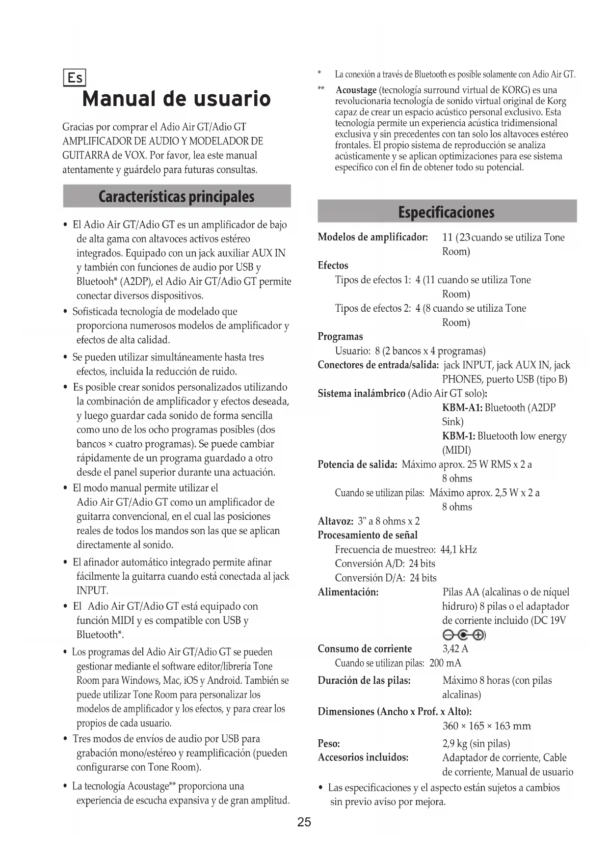 cuando se utiliza Tone Room) Efectos Tipos de efectos 1: 4 (11 cuando se utiliza Tone Room) Tipos de efectos 2: 4 (8 cuando se utiliza Tone Room) Programas Usuario: 8 (2 bancos x 4 programas) Conectores de entrada/salida: jack INPUT, jack AUX IN, jack PHONES, puerto USB (tipo B) Sistema inalámbrico (Adio Air GT solo): KBM-A1: Bluetooth (A2DP Sink) KBM-1: Bluetooth low energy (MIDI) Potencia de salida: Máximo aprox. 25 W RMS x 2 a 8 ohms Cuando se utilizan pilas: Máximo aprox. 2,5 W x 2 a 8 ohms Altavoz: 3" a 8 ohms x 2 Procesamiento de señal Frecuencia de muestreo: 44,1 kHz Conversión A/D: 24 bits Conversión D/A: 24 bits Alimentación: Pilas AA (alcalinas o de níquel hidruro) 8 pilas o el adaptador de corriente incluido (DC 19V
