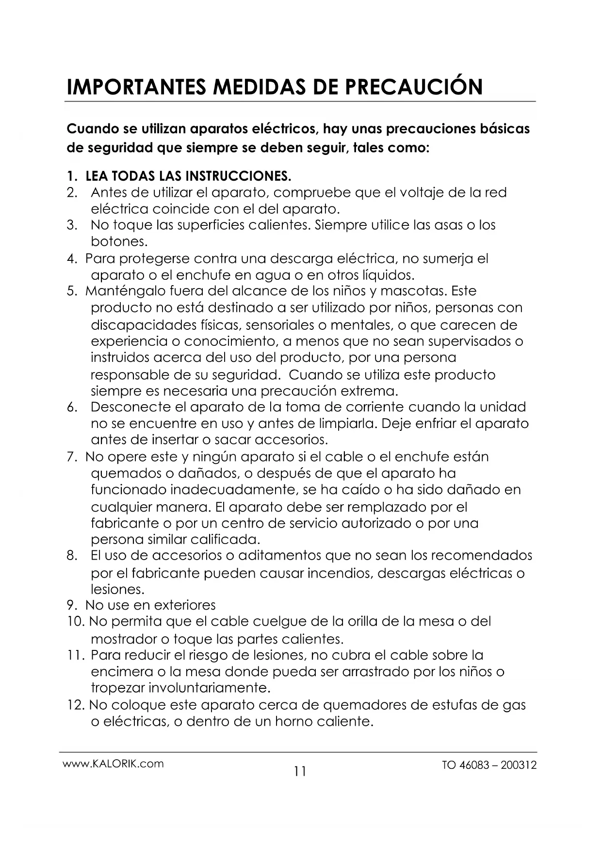 www.KALORIK.com TO 46083 – 200312 tienda donde le compró: a menudo, nuestro Servicio al Consumidor puede ayudar a resolver el problema sin que el producto tenga que ser reparado. Si hace falta una reparación, uno de nuestros representantes puede confirmar si el producto está bajo garantía y dirigirle al servicio post- venta más próximo. Si fuera el caso, traiga el producto (o envíelo, correctamente franqueado) con la prueba de compra que mencione el número de autorización de devolución indicado por nuestro Servicio al Consumidor, al servicio post- venta KALORIK más próximo. (Visite nuestra web www.KALORIK.com o llame al Servicio al Consumidor para obtener la dirección del Servicio post- venta KALORIK exclusivo más próximo). Si envía el producto, le rogamos añadan una carta explicando la naturaleza del defecto. Si tiene preguntas adicionales, por favor llame al Servicio al Consumidor (véase abajo para los datos completos), de lunes a jueves, de las 9:00 a las 17:00 (EST), y el viernes de las 9:00 a las 16:00 (EST). Note que las horas pueden ser modificadas. Si quiere escribirnos, puede hacerlo a la dirección siguiente: KALORIK Servicio al Consumidor Team International Group of America Inc. 16175 NW 49