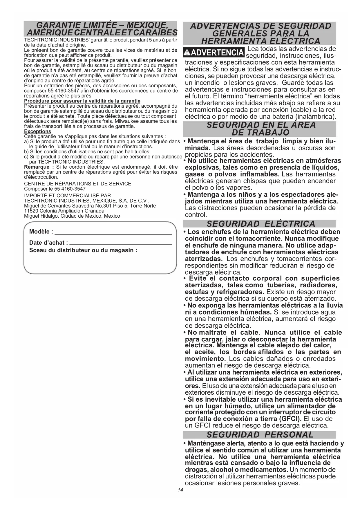Techtronic Industries Mexico, S.A. de C.V. Av. Presidente Masarik 29 Piso 7 11560 Polanco V Seccion Miguel Hidalgo, Distrito Federal, México 01 (800) 030-7777 o (55) 4160-3540 Lunes a Viernes (9am a 6pm) O contáctanos en www.milwaukeetool.com.mx GARANTÍA LIMITADA - E.U.A. Y CANADÁ Cada herramienta eléctrica* de MILWAUKEE (ver excepciones a continuación) está garantizada para el comprador original únicamente de que no tenga material y mano de obra defectuosos. Sujeto a ciertas excepciones, MILWAUKEE reparará o reemplazará cualquier parte en una herramienta eléctrica que tenga defectos de material o mano de obra según lo determine MILWAUKEE mediante una revisión, por un periodo de cinco (5) años** después de la fecha de compra a menos que se indique lo contrario. Al devolver la herramienta eléctrica a un Centro de Servicio de la fábrica de MILWAUKEE o a una Estación de Servicio Autorizada de MILWAUKEE, se requiere que el ete esté pagado por adelantado y asegurado. Se debe incluir una copia del comprobante de compra con el producto devuelto. Esta garantía no aplica a daños que MILWAUKEE determine que son ocasionados por reparaciones o intentos de reparaciones realizados por una persona que no sea personal autorizado de MILWAUKEE, uso indebido, alteraciones, maltrato, desgaste normal, falta de mantenimiento o accidentes.Desgaste normal: Muchas herramientas eléctricas necesitan un reemplazo periódico de partes y servicio para lograr el mejor des-empeño. Esta garantía no cubre la reparación cuando el uso normal ha agotado la vida de una parte, incluyendo sin limitar a mandriles, cepillos, cables, zapatas de la sierra, abrazaderas de la hoja, anillos en O, sellos, protectores, hojas de desatornilladores, pistones, herrajes, levantadores y arandelas de cubierta de los protectores.*Esta garantía no cubre clavadoras y grapadoras neumáticas, pistola de pintura a presión, baterías inalámbricas, generadores de energía portátil de gasolina, herramientas de mano, palanca y cadena de mano de polipasto - eléctricas, indumentaria calefactada M12™, producto reacondicionado y productos de prueba y medición. Existen garantías por separado y distintas disponibles para estos productos.**El periodo de garantía para los radios para obra, puerto de energía M12™, fuente de poder M18™, ventiladores para obra y carretillas de trabajo industrial Trade Titan™ es de un (1) año a partir de la fecha de compra. El periodo de garantía para los Cables de limpieza de drenaje es de dos (2) años a partir de la fecha de compra. El periodo de garantía de la Pistola de calor compacta M18™ de la Extractor de polvo de 8 galones es de tres (3) años a partir de la fecha de com-pra. El periodo de garantía de las lámparas de LED en la Lámpara de trabajo LED y el Bulbo mejorado de LED para la Luz de trabajo es por la vida del producto sujeto a las limitaciones anteriores. Si durante el uso normal el LED o Bulbo de LED falla, la parte será reemplazada sin cargo. No se requiere el registro de la garantía para obtener la garantía cor-respondiente a un producto de herramienta eléctrica de MILWAUKEE. La fecha de manufactura del producto se utilizará para determinar el periodo de garantía si no se proporciona comprobante de compra al solicitar el servicio en garantía.LA ACEPTACIÓN DE LOS REMEDIOS EXCLUSIVOS DE REPA-RACIÓN Y REEMPLAZO AQUÍ DESCRITOS ES UNA CONDICIÓN DEL CONTRATO PARA LA COMPRA DE TODO PRODUCTO DE MILWAUKEE. SI USTED NO ACEPTA ESTA CONDICIÓN, NO DEBE COMPRAR EL PRODUCTO. MILWAUKEE NO SERÁ RESPON-SABLE EN NINGÚN CASO DE DAÑOS INCIDENTALES, ESPE-CIALES, EMERGENTES O PUNITIVOS NI DE NINGÚN COSTO, HONORARIOS LEGALES, GASTOS, PÉRDIDAS O DEMORAS ALE-GADOS COMO CONSECUENCIA DE ALGÚN DAÑO, FALLA O DE-FECTO EN NINGÚN PRODUCTO, INCLUYENDO, ENTRE OTROS, RECLAMACIONES POR PÉRDIDA DE UTILIDADES. ALGUNOS ESTADOS NO PERMITEN LA EXCLUSIÓN O LIMITACIÓN DE RE-SPONSABILIDAD POR DAÑOS INCIDENTALES O EMERGENTES, POR LO QUE LA ANTERIOR LIMITACIÓN O EXCLUSIÓN PODRÍA NO APLICARSE EN SU CASO. ESTA GARANTÍA ES EXCLUSIVA Y REEMPLAZA TODAS LAS DEMÁS GARANTÍAS EXPRESAS, ES-CRITAS U ORALES. EN LA MEDIDA EN QUE LO PERMITA LA LEY, MILWAUKEE DESCONOCE CUALQUIER GARANTÍA IMPLÍCITA, INCLUYENDO SIN LIMITACIÓN CUALQUIER GARANTÍA IMPLÍCITA DE COMERCIABILIDAD O IDONEIDAD PARA UN FIN O USO ESPE-CÍFICO; EN LA MEDIDA EN QUE DICHO DESCONOCIMIENTO NO SEA PERMITIDO POR LA LEY, DICHAS GARANTÍAS IMPLÍCITAS SE LIMITAN A LA DURACIÓN DE LA GARANTÍA EXPRESA COR-RESPONDIENTE SEGÚN SE DESCRIBIÓ ANTERIORMENTE. ALGUNOS ESTADOS NO PERMITEN LIMITACIONES SOBRE LA DURACIÓN DE UNA GARANTÍA IMPLÍCITA, POR LO QUE LA ANTERIOR LIMITACIÓN PUDIERA NO APLICARSE A USTED. ESTA GARANTÍA LE DA DERECHOS LEGALES ESPECÍFICOS Y USTED PODRÍA ADEMÁS TENER OTROS DERECHOS QUE VARÍAN DE UN ESTADO A OTRO.Esta garantía aplica al producto vendido en los Estados Unidos y Canadá únicamente.Consulte la “Búsqueda de centro de servicio” en la sección de Partes y servicio del sitio web de MILWAUKEE en www.milwaukeetool.com o llame al 1.800.SAWDUST (1.800.729.3878) para localizar su centro de servicio más cercano para darle servicio con y sin garantía a una herramienta eléctrica de Milwaukee. PÓLIZA DE GARANTÍA - VALIDA