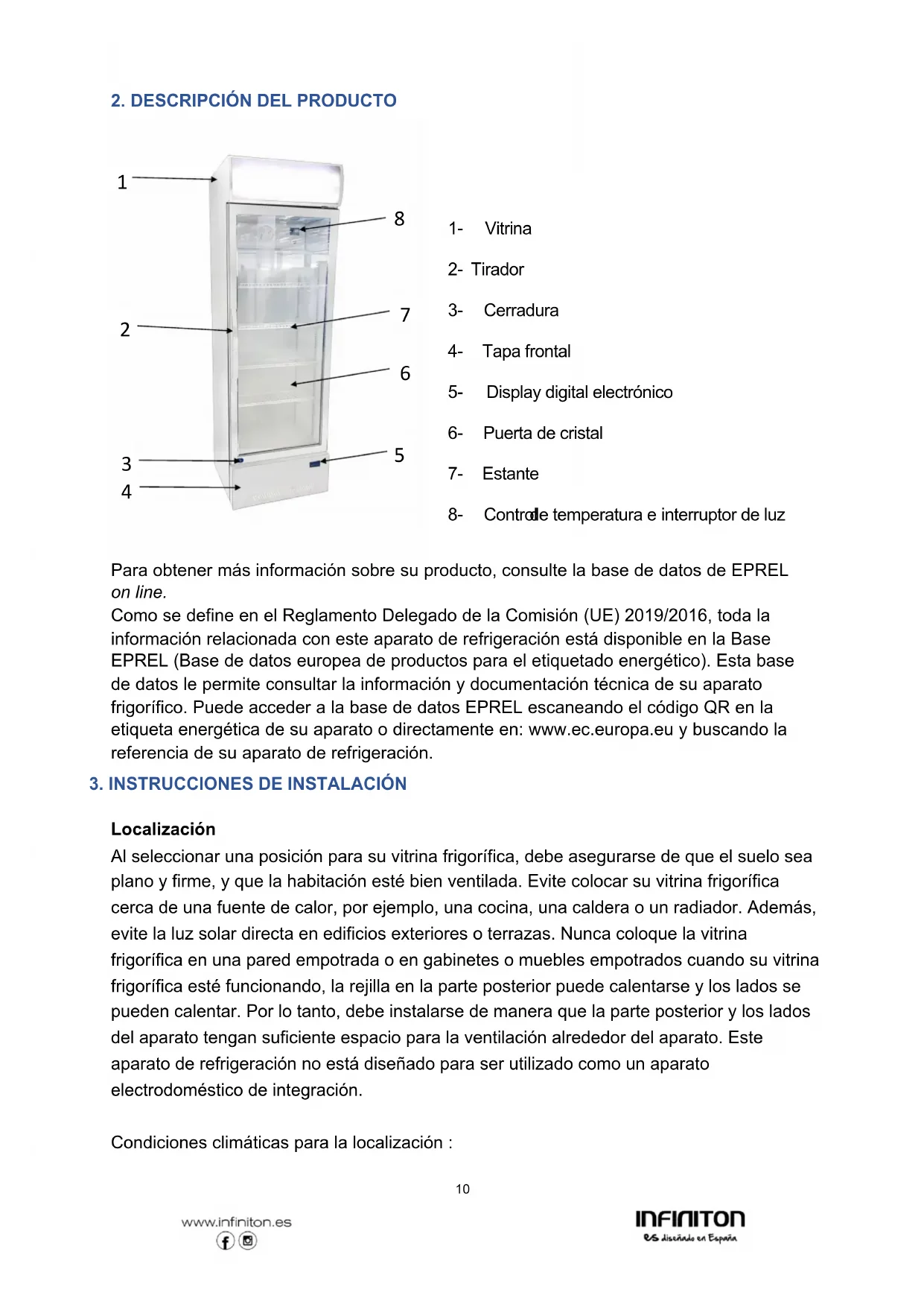 Para obtener más información sobre su producto, consulte la base de datos de EPREL on line. Como se define en el Reglamento Delegado de la Comisión (UE) 2019/2016, toda la información relacionada con este aparato de refrigeración está disponible en la Base EPREL (Base de datos europea de productos para el etiquetado energético). Esta base de datos le permite consultar la información y documentación técnica de su aparato frigorífico. Puede acceder a la base de datos EPREL escaneando el código QR en la etiqueta energética de su aparato o directamente en: www.ec.europa.eu y buscando la referencia de su aparato de refrigeración.