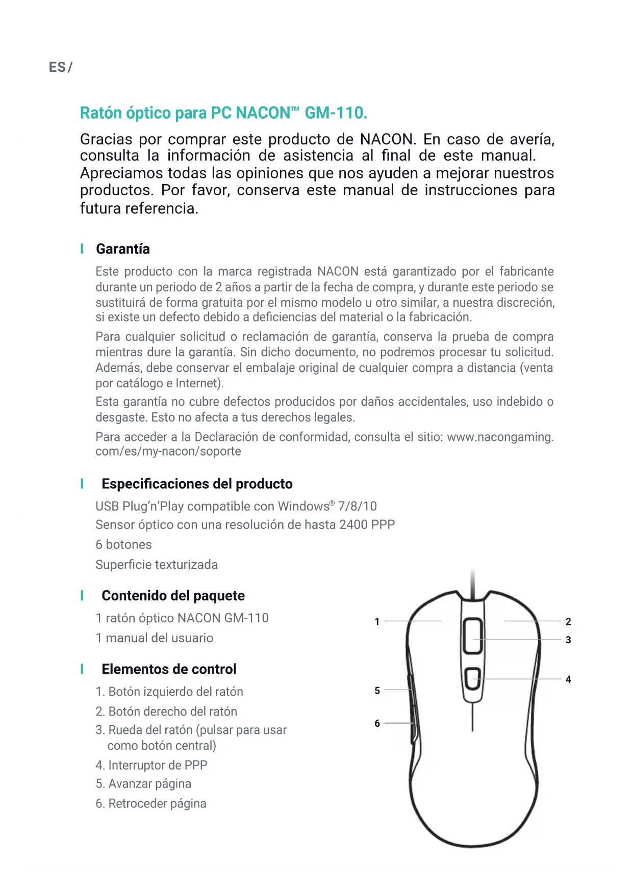 7/8/10 Sensor óptico con una resolución de hasta 2400 PPP 6 botones Supercie texturizada I Contenidodelpaquete 1 ratón óptico NACON GM-110 1 manual del usuario I Elementosdecontrol