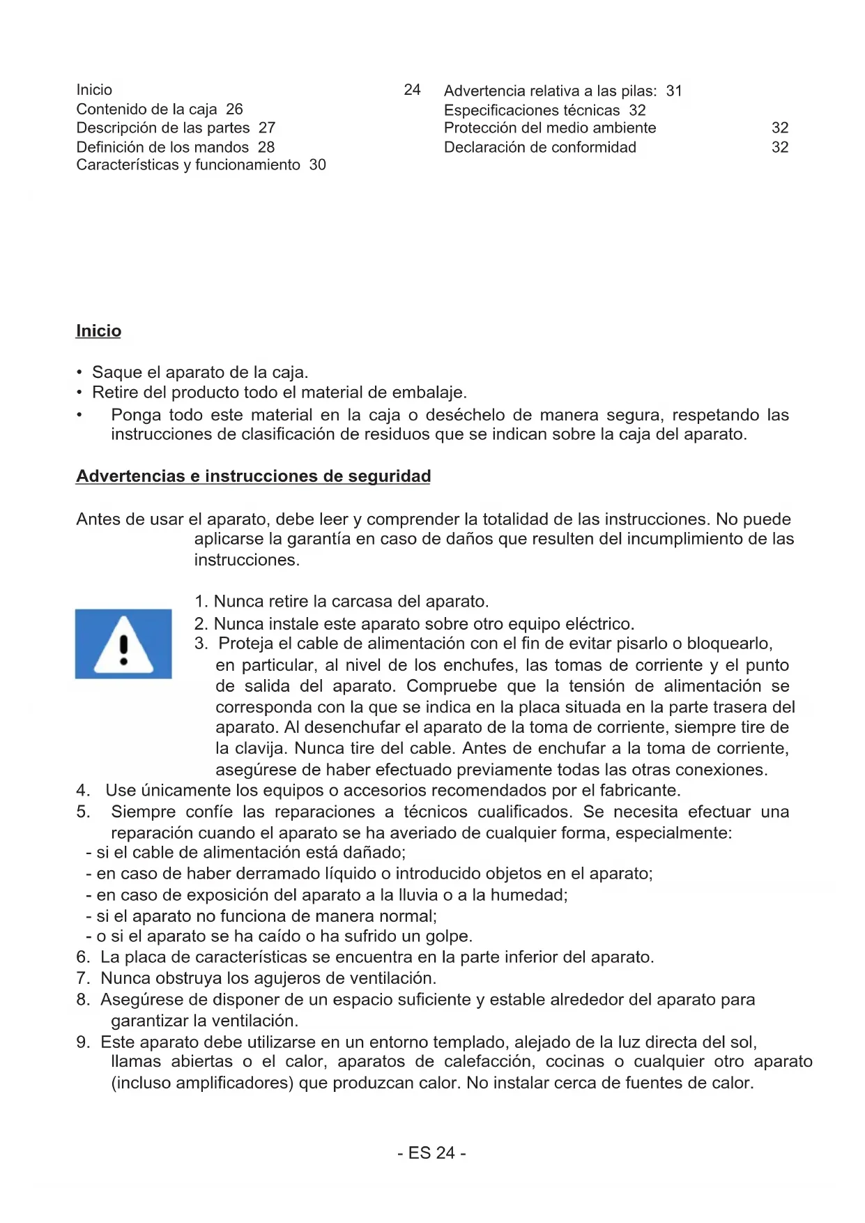 llamas abiertas o el calor, aparatos de calefacción, cocinas o cualquier otro aparato (incluso amplicadores) que produzcan calor. No inalar cerca de fuentes de calor. Inicio 24 Contenido de la caja 26 Descripción de las partes 27 Denición de los mandos 28 Caracteríicas y funcionamiento 30 Advertencia relativa a las pilas: 31 Especicaciones técnicas 32 Protección del medio ambiente 32 Declaración de conformidad 32- ES 25 -