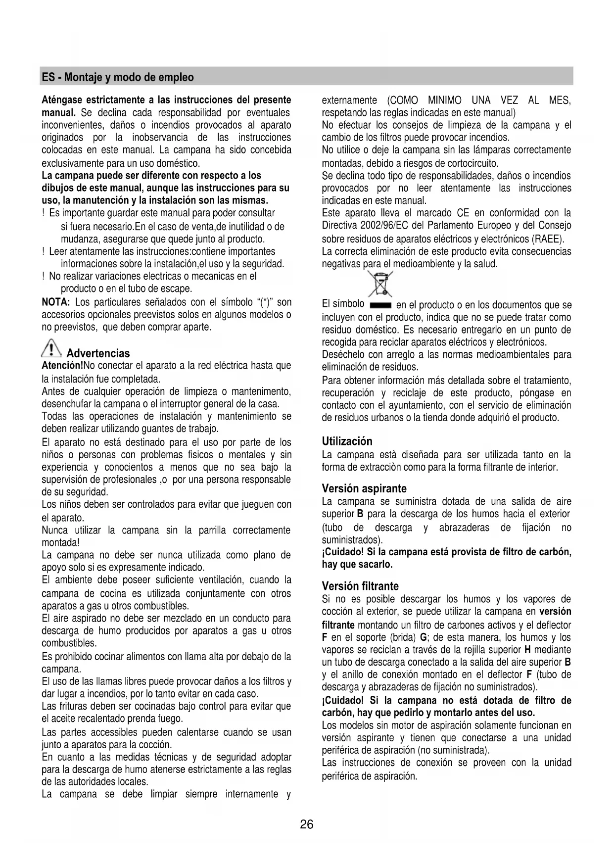 Dans l’éventualité où l’éclairage ne devait pas fonctionner, vérifier si les lampes ont été introduites correctement dans leur logement, avant de contacter le service après-vente.26 ES - Montaje y modo de empleo Aténgase estrictamente a las instrucciones del presente manual. Se declina cada responsabilidad por eventuales inconvenientes, daños o incendios provocados al aparato originados por la inobservancia de las instrucciones colocadas en este manual. La campana ha sido concebida exclusivamente para un uso doméstico. La campana puede ser diferente con respecto a los dibujos de este manual, aunque las instrucciones para su uso, la manutención y la instalación son las mismas. ! Es importante guardar este manual para poder consultar si fuera necesario.En el caso de venta,de inutilidad o de mudanza, asegurarse que quede junto al producto. ! Leer atentamente las instrucciones:contiene importantes informaciones sobre la instalación,el uso y la seguridad. ! No realizar variaciones electricas o mecanicas en el producto o en el tubo de escape. NOTA: Los particulares señalados con el símbolo “(*)” son accesorios opcionales preevistos solos en algunos modelos o no preevistos, que deben comprar aparte. Advertencias Atención!No conectar el aparato a la red eléctrica hasta que la instalación fue completada. Antes de cualquier operación de limpieza o mantenimento, desenchufar la campana o el interruptor general de la casa. Todas las operaciones de instalación y mantenimiento se deben realizar utilizando guantes de trabajo. El aparato no está destinado para el uso por parte de los niños o personas con problemas fisicos o mentales y sin experiencia y conocientos a menos que no sea bajo la supervisión de profesionales ,o por una persona responsable de su seguridad. Los niños deben ser controlados para evitar que jueguen con el aparato. Nunca utilizar la campana sin la parrilla correctamente montada! La campana no debe ser nunca utilizada como plano de apoyo solo si es expresamente indicado. El ambiente debe poseer suficiente ventilación, cuando la campana de cocina es utilizada conjuntamente con otros aparatos a gas u otros combustibles. El aire aspirado no debe ser mezclado en un conducto para descarga de humo producidos por aparatos a gas u otros combustibles. Es prohibido cocinar alimentos con llama alta por debajo de la campana. El uso de las llamas libres puede provocar daños a los filtros y dar lugar a incendios, por lo tanto evitar en cada caso. Las frituras deben ser cocinadas bajo control para evitar que el aceite recalentado prenda fuego. Las partes accessibles pueden calentarse cuando se usan junto a aparatos para la cocción. En cuanto a las medidas técnicas y de seguridad adoptar para la descarga de humo atenerse estrictamente a las reglas de las autoridades locales. La campana se debe limpiar siempre internamente y externamente (COMO MINIMO UNA VEZ AL MES, respetando las reglas indicadas en este manual) No efectuar los consejos de limpieza de la campana y el cambio de los filtros puede provocar incendios. No utilice o deje la campana sin las lámparas correctamente montadas, debido a riesgos de cortocircuito. Se declina todo tipo de responsabilidades, daños o incendios provocados por no leer atentamente las instrucciones indicadas en este manual. Este aparato lleva el marcado CE en conformidad con la Directiva 2002/96/EC del Parlamento Europeo y del Consejo sobre residuos de aparatos eléctricos y electrónicos (RAEE). La correcta eliminación de este producto evita consecuencias negativas para el medioambiente y la salud. El símbolo en el producto o en los documentos que se incluyen con el producto, indica que no se puede tratar como residuo doméstico. Es necesario entregarlo en un punto de recogida para reciclar aparatos eléctricos y electrónicos. Deséchelo con arreglo a las normas medioambientales para eliminación de residuos. Para obtener información más detallada sobre el tratamiento, recuperación y reciclaje de este producto, póngase en contacto con el ayuntamiento, con el servicio de eliminación de residuos urbanos o la tienda donde adquirió el producto. Utilización La campana està diseñada para ser utilizada tanto en la forma de extracciòn como para la forma filtrante de interior. Versión aspirante La campana se suministra dotada de una salida de aire superior B para la descarga de los humos hacia el exterior (tubo de descarga y abrazaderas de fijación no suministrados). ¡Cuidado! Si la campana está provista de filtro de carbón, hay que sacarlo. Versión filtrante Si no es posible descargar los humos y los vapores de cocción al exterior, se puede utilizar la campana en versión filtrante montando un filtro de carbones activos y el deflector F en el soporte (brida) G; de esta manera, los humos y los vapores se reciclan a través de la rejilla superior H mediante un tubo de descarga conectado a la salida del aire superior B y el anillo de conexión montado en el deflector F (tubo de descarga y abrazaderas de fijación no suministrados). ¡Cuidado! Si la campana no está dotada de filtro de carbón, hay que pedirlo y montarlo antes del uso. Los modelos sin motor de aspiración solamente funcionan en versión aspirante y tienen que conectarse a una unidad periférica de aspiración (no suministrada). Las instrucciones de conexión se proveen con la unidad periférica de aspiración.27 Instalación La distancia mínima entre la superficie de cocción y la parte más baja de la campana no debe ser inferior a 50cm en el caso de cocinas electricas y de 65cm en el caso de cocinas a gas o mixtas. Si las instrucciones para la instalación del dispositivo para cocinar con gas especifican una distancia mayor, hay que tenerlo en consideración.
