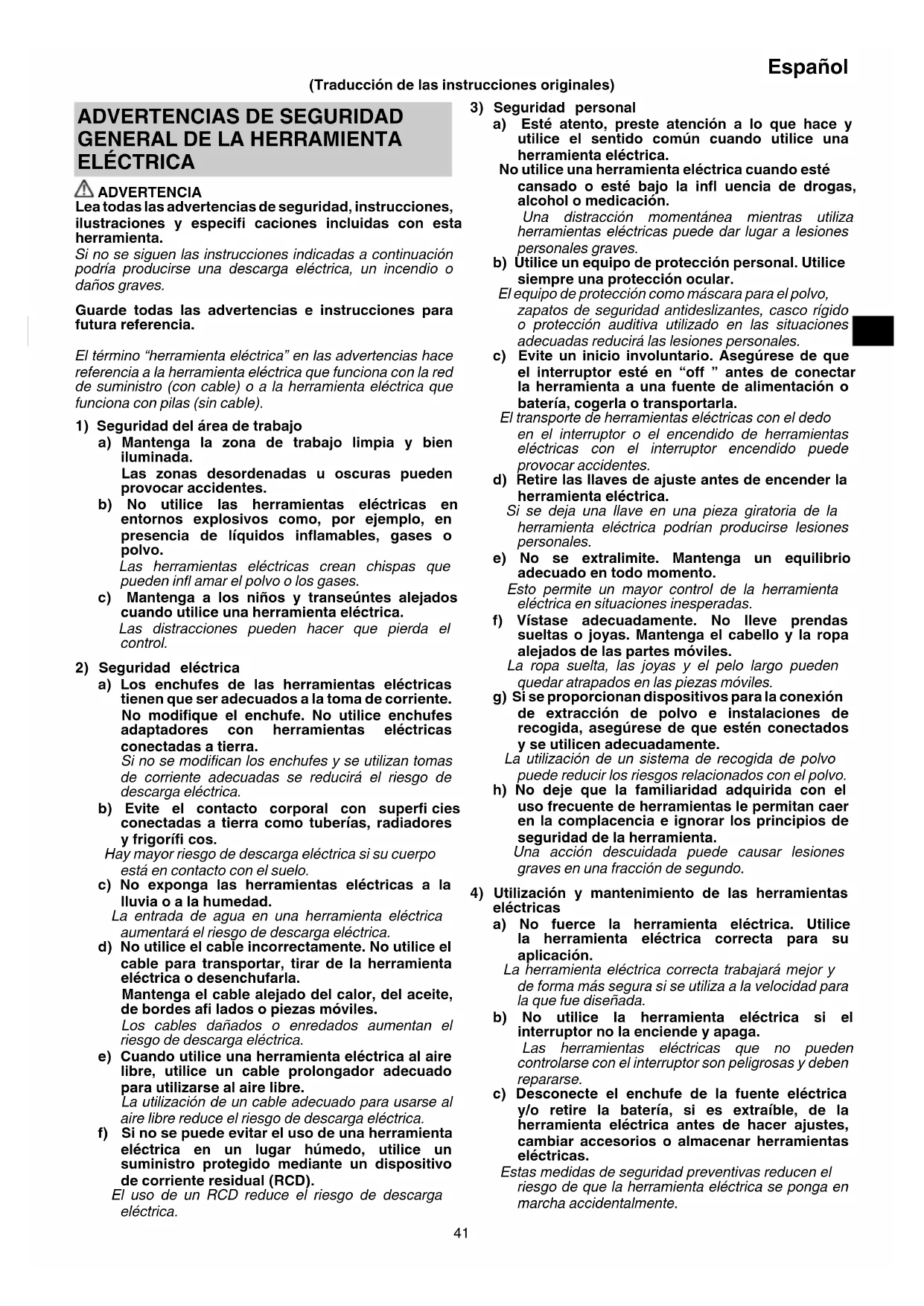 a) Los enchufes de las herramientas eléctricas tienen que ser adecuados a la toma de corriente. No modifi que el enchufe. No utilice enchufes adaptadores con herramientas eléctricas conectadas a tierra. Si no se modifi can los enchufes y se utilizan tomas de corriente adecuadas se reducirá el riesgo de descarga eléctrica. b) Evite el contacto corporal con superfi cies conectadas a tierra como tuberías, radiadores y frigorífi cos. Hay mayor riesgo de descarga eléctrica si su cuerpo está en contacto con el suelo. c) No exponga las herramientas eléctricas a la lluvia o a la humedad. La entrada de agua en una herramienta eléctrica aumentará el riesgo de descarga eléctrica. d) No utilice el cable incorrectamente. No utilice el cable para transportar, tirar de la herramienta eléctrica o desenchufarla. Mantenga el cable alejado del calor, del aceite, de bordes afi lados o piezas móviles. Los cables dañados o enredados aumentan el riesgo de descarga eléctrica. e) Cuando utilice una herramienta eléctrica al aire libre, utilice un cable prolongador adecuado para utilizarse al aire libre. La utilización de un cable adecuado para usarse al aire libre reduce el riesgo de descarga eléctrica. f) Si no se puede evitar el uso de una herramienta eléctrica en un lugar húmedo, utilice un suministro protegido mediante un dispositivo de corriente residual (RCD). El uso de un RCD reduce el riesgo de descarga eléctrica. (Traducción de las instrucciones originales) 00BookP14DSLEU.indb4100BookP14DSLEU.indb41 2019/04/2215:12:032019/04/2215:12:0342 Español d) Guarde las herramientas eléctricas que no se utilicen fuera del alcance de los niños, y no permita que utilicen las herramientas eléctricas personas no familiarizadas con las mismas o con estas instrucciones. Las herramientas eléctricas son peligrosas si son utilizadas por usuarios sin formación. e) Realice el mantenimiento de las herramientas eléctricas y accesorios. Compruebe si las piezas móviles están mal alineadas o unidas, si hay alguna pieza rota u otra condición que pudiera afectar al funcionamiento de las herramientas eléctricas. Si la herramienta eléctrica está dañada, llévela a reparar antes de utilizarla. Se producen muchos accidentes por no realizar un mantenimiento correcto de las herramientas eléctricas. f) Mantenga las herramientas de corte afi ladas y limpias. Las herramientas de corte correctamente mantenidas con los bordes de corte afi lados son más fáciles de controlar, y existe menor riesgo de que se atasquen. g) Utilice la herramienta eléctrica, los accesorios y las brocas de la herramienta, etc. de acuerdo con estas instrucciones, teniendo en cuenta las condiciones de trabajo y el trabajo que se va a realizar. La utilización de la herramienta eléctrica para operaciones diferentes a las previstas podría dar lugar a una situación peligrosa. h) Mantenga los mangos y las superfi cies de agarre secas, limpias y libres de aceite y grasa. Los mangos y las superfi cies de agarre resbaladizos no permiten el manejo y el control seguros de la herramienta en situaciones inesperadas.