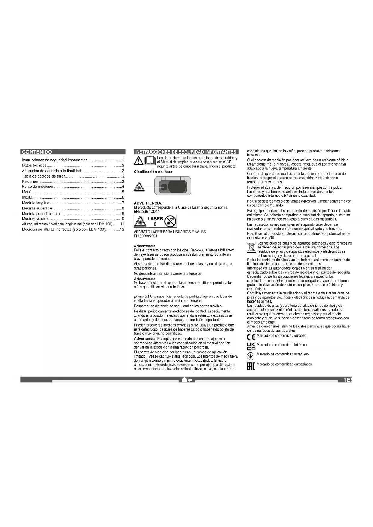 - EN 50689:2021 Advertencia: Evite el contacto directo con los ojos. Debido a la intensa brillantez del rayo láser se puede producir un deslumbramiento durante un breve período de tiempo. Absténgase de mirar directamente al rayo láser y no dirija éste a otras personas. No deslumbrar intencionadamente a terceros. Advertencia: No hacer funcionar el aparato láser cerca de niños o permitir a los niños que utilicen el aparato láser. ¡Atención! Una supercie reectante podría dirigir el rayo láser de vuelta hacia el operador o hacia otra persona. Respetar una distancia de seguridad de las partes móviles. Realizar periódicamente mediciones de control. Especialmente cuando el producto ha estado sometido a esfuerzos excesivos así como antes y después de tareas de medición importantes. Pueden producirse medidas erróneas si se utiliza un producto que esté defectuoso, después de haberse caído o haber sido objeto de transformaciones no permitidas. Advertencia: El empleo de elementos de control, ajustes u operaciones diferentes a las especicadas en el manual podrían derivar en la exposición a una radiación peligrosa. El aparato de medición por láser tiene un campo de aplicación limitado. (Véase capítulo Datos técnicos). Los intentos de medir fuera del rango máximo y mínimo ocasionan inexactitudes. El uso en condiciones meteorológicas adversas como por ejemplo demasiado calor, demasiado frío, luz solar brillante, lluvia, nieve, niebla u otras condiciones que limitan la visión, pueden producir mediciones inexactas. Si el aparato de medición por láser se lleva de un ambiente cálido a un ambiente frío (o al revés), espere hasta que el aparato se haya adaptado a la nueva temperatura ambiente Guardar el aparato de medición por láser siempre en el interior de locales, proteger el aparato contra sacudidas y vibraciones o temperaturas extremas Proteger el aparato de medición por láser siempre contra polvo, humedad y alta humedad del aire. Esto puede destruir los componentes internos o inuir en la exactitud. No utilice detergentes o disolventes agresivos. Limpiar solamente con un paño limpio y blando. Evite golpes fuertes sobre el aparato de medición por láser o la caída del mismo. Se debería comprobar la exactitud del aparato, si éste se ha caído o si ha estado expuesto a otras cargas mecánicas. Las reparaciones necesarias en este aparato láser deben ser realizadas únicamente por personal especializado y autorizado. No utilizar el producto en áreas con una atmósfera potencialmente explosiva o volátil. Los residuos de pilas y de aparatos eléctricos y electrónicos no se deben desechar junto con la basura doméstica. Los residuos de pilas y de aparatos eléctricos y electrónicos se deben recoger y desechar por separado. Retire los residuos de pilas y acumuladores, así como las fuentes de iluminación de los aparatos antes de desecharlos. Infórmese en las autoridades locales o en su distribuidor especializado sobre los centros de reciclaje y los puntos de recogida. Dependiendo de las disposiciones locales al respecto, los distribuidores minoristas pueden estar obligados a aceptar de forma gratuita la devolución de residuos de pilas, aparatos eléctricos y electrónicos. Contribuya mediante la reutilización y el reciclaje de sus residuos de pilas y de aparatos eléctricos y electrónicos a reducir la demanda de materias primas. Los residuos de pilas (sobre todo de pilas de iones de litio) y de aparatos eléctricos y electrónicos contienen valiosos materiales reutilizables que pueden tener efectos negativos para el medio ambiente y su salud si no son desechados de forma respetuosa con el medio ambiente. Antes de desecharlos, elimine los datos personales que podría haber en los residuos de sus aparatos. Marcado de conformidad europeo Marcado de conformidad británico Marcado de conformidad ucraniano Marcado de conformidad euroasiático CONTENIDO Instrucciones de seguridad importantes p. 1