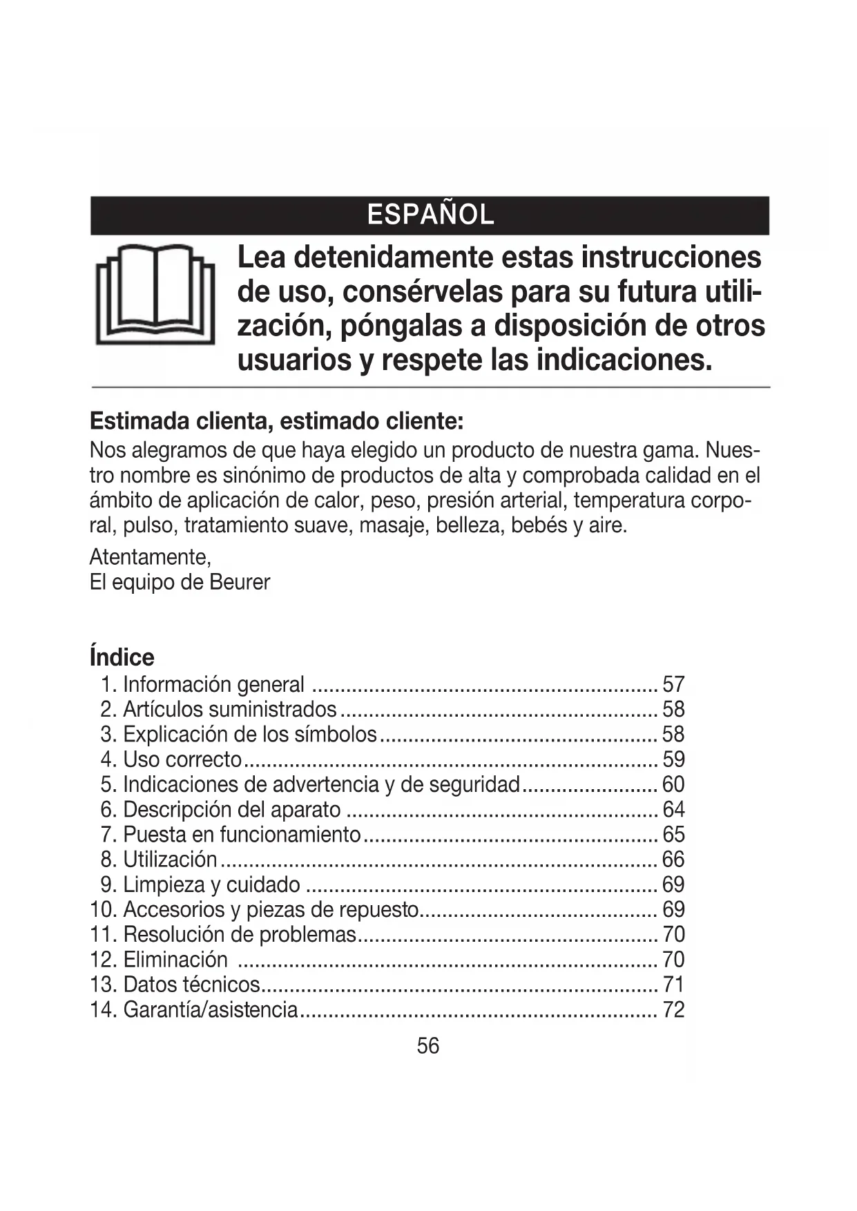 zación, póngalas a disposición de otros usuarios y respete las indicaciones. Estimada clienta, estimado cliente: Nos alegramos de que haya elegido un producto de nuestra gama. Nues- tro nombre es sinónimo de productos de alta y comprobada calidad en el ámbito de aplicación de calor, peso, presión arterial, temperatura corpo- ral, pulso, tratamiento suave, masaje, belleza, bebés y aire. Atentamente, El equipo de Beurer