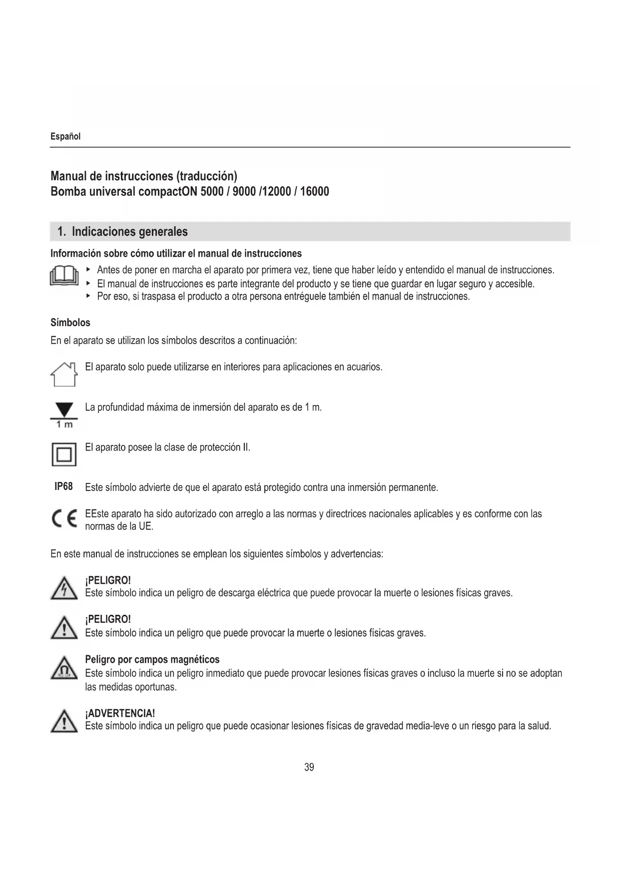 Vedi a pagina 3.39 Español Manual de instrucciones (traducción) Bomba universal compactON 5000 / 9000 /12000 / 16000