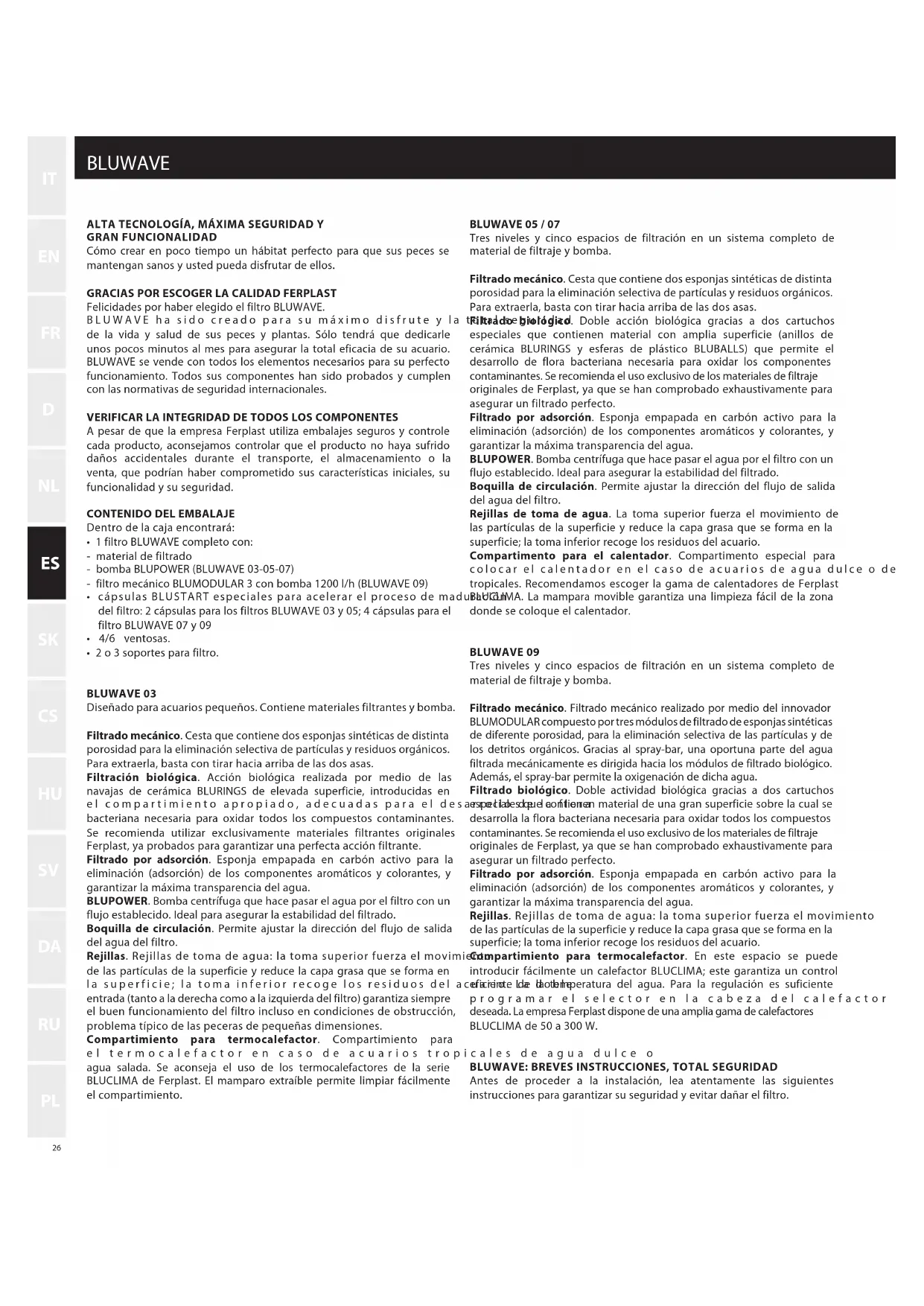 Felicidades por haber elegido el filtró BLUWAVE. BLUWAVE ha sido創造o para su mayor disfruete y la de la vida y salute de sus peces y plantas. Sólo tendrá que dedicarle todos menosoles para asegurar la total eficacidia de su acuario. BLUWAVE se vendecosomestedes elementosnecesariospara superfecto funciona. Todos sus componentes han sido probados y cumplen con las normativasde seguidad internacionales.