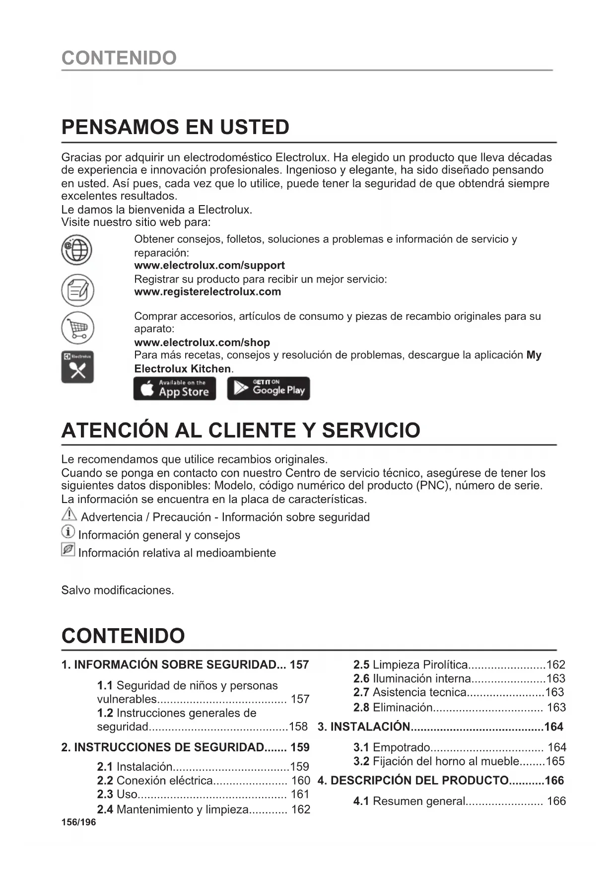 Gracias por adquirir un electrodoméstico Electrolux. Ha elegido un producto que lleva décadas de experiencia e innovación profesionales. Ingenioso y elegante, ha sido diseñado pensando en usted. Así pues, cada vez que lo utilice, puede tener la seguridad de que obtendrá siempre excelentes resultados. Le damos la bienvenida a Electrolux. Visite nuestro sitio web para: Obtener consejos, folletos, soluciones a problemas e información de servicio y reparación: www.electrolux.com/support Registrar su producto para recibir un mejor servicio: www.registerelectrolux.com Comprar accesorios, artículos de consumo y piezas de recambio originales para su aparato: www.electrolux.com/shop Para más recetas, consejos y resolución de problemas, descargue la aplicación My Electrolux Kitchen.