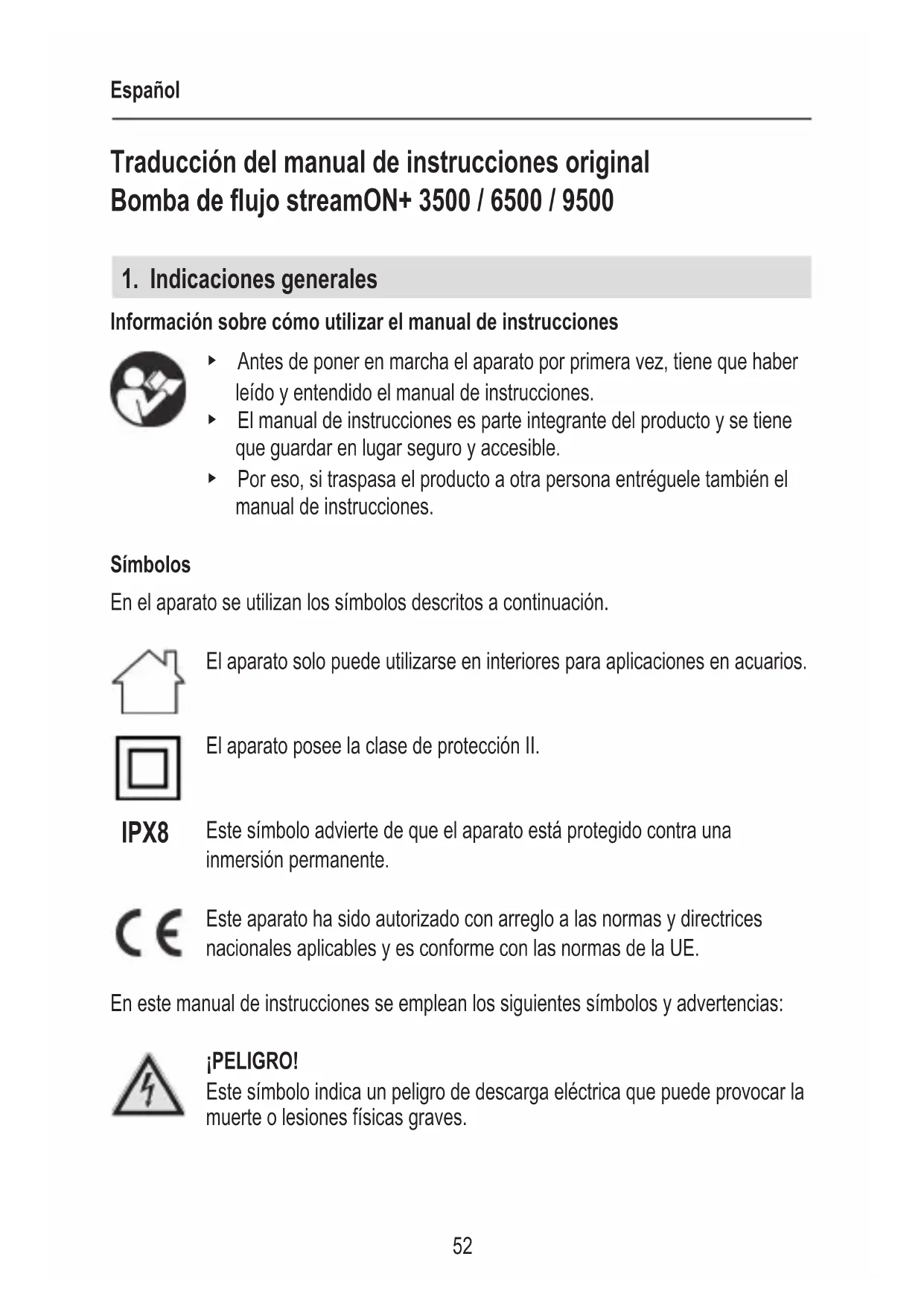 Información sobre cómo utilizar el manual de instrucciones ▶ Antes de poner en marcha el aparato por primera vez, tiene que haber leído y entendido el manual de instrucciones. ▶ El manual de instrucciones es parte integrante del producto y se tiene que guardar en lugar seguro y accesible. ▶ Por eso, si traspasa el producto a otra persona entréguele también el manual de instrucciones. Símbolos En el aparato se utilizan los símbolos descritos a continuación. El aparato solo puede utilizarse en interiores para aplicaciones en acuarios. El aparato posee la clase de protección II. Este símbolo advierte de que el aparato está protegido contra una inmersión permanente. Este aparato ha sido autorizado con arreglo a las normas y directrices nacionales aplicables y es conforme con las normas de la UE. En este manual de instrucciones se emplean los siguientes símbolos y advertencias: ¡PELIGRO! Este símbolo indica un peligro de descarga eléctrica que puede provocar la muerte o lesiones físicas graves. IPX8Español