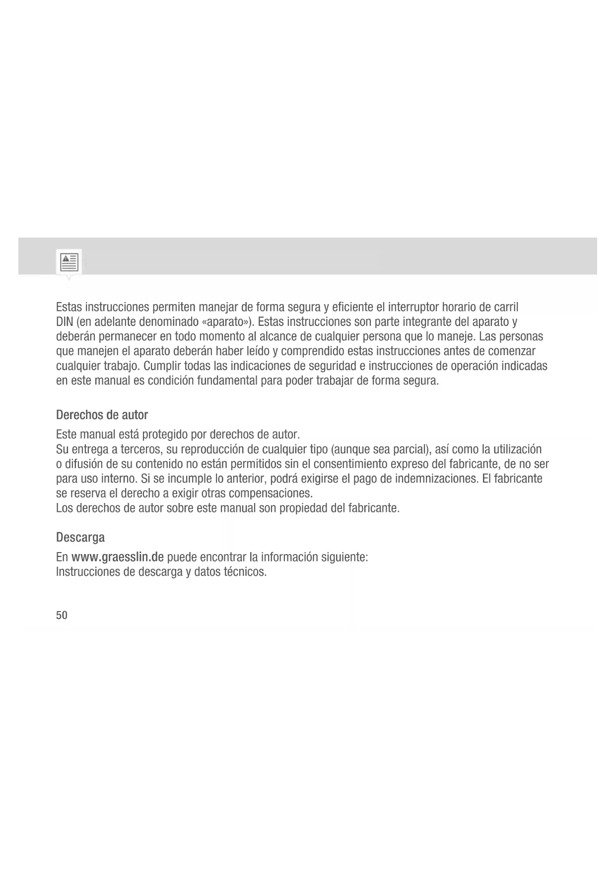 Smaltimento Smaltimento inappropriato Pericolo per l’ambiente dovuto a smaltimento errato! Uno smaltimento errato può provocare pericoli per l’ambiente. − Smaltire correttamente i rottami elettrici e i componenti elettronici, ovvero smistarli secondo il gruppo dei materiali delle parti da smaltire. − In generale, lo smaltimento dev’essere rispettoso dell’ambiente nella misura stabilita dallo stato della tecnica di tutela ambientale, riciclaggio e smaltimento. TUTELA AMBIEN- TALE!50 Estas instrucciones permiten manejar de forma segura y eciente el interruptor horario de carril DIN (en adelante denominado «aparato»). Estas instrucciones son parte integrante del aparato y deberán permanecer en todo momento al alcance de cualquier persona que lo maneje. Las personas que manejen el aparato deberán haber leído y comprendido estas instrucciones antes de comenzar cualquier trabajo. Cumplir todas las indicaciones de seguridad e instrucciones de operación indicadas en este manual es condición fundamental para poder trabajar de forma segura. Derechos de autor Este manual está protegido por derechos de autor. Su entrega a terceros, su reproducción de cualquier tipo (aunque sea parcial), así como la utilización o difusión de su contenido no están permitidos sin el consentimiento expreso del fabricante, de no ser para uso interno. Si se incumple lo anterior, podrá exigirse el pago de indemnizaciones. El fabricante se reserva el derecho a exigir otras compensaciones. Los derechos de autor sobre este manual son propiedad del fabricante. Descarga En www.graesslin.de puede encontrar la información siguiente: Instrucciones de descarga y datos técnicos.51