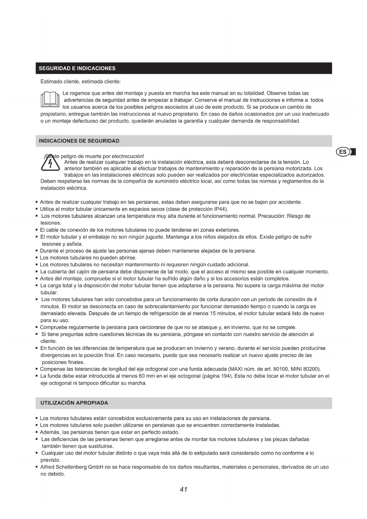 ¡Existe peligro de muerte por electrocución! Antes de realizar cualquier trabajo en la instalación eléctrica, esta deberá desconectarse de la tensión. Lo anterior también es aplicable al efectuar trabajos de mantenimiento y reparación de la persiana motorizada. Los trabajos en las instalaciones eléctricas solo pueden ser realizados por electricistas especializados autorizados. Deben respetarse las normas de la compañía de suministro eléctrico local, así como todas las normas y reglamentos de la instalación eléctrica. Antes de realizar cualquier trabajo en las persianas, estas deben asegurarse para que no se bajen por accidente. Utilice el motor tubular únicamente en espacios secos (clase de protección IP44). Los motores tubulares alcanzan una temperatura muy alta durante el funcionamiento normal. Precaución: Riesgo de lesiones. El cable de conexión de los motores tubulares no puede tenderse en zonas exteriores. El motor tubular y el embalaje no son ningún juguete. Mantenga a los niños alejados de ellos. Existe peligro de sufrir lesiones y asxia. Durante el proceso de ajuste las personas ajenas deben mantenerse alejadas de la persiana. Los motores tubulares no pueden abrirse. Los motores tubulares no necesitan mantenimiento ni requieren ningún cuidado adicional. La cubierta del cajón de persiana debe disponerse de tal modo, que el acceso al mismo sea posible en cualquier momento. Antes del montaje, compruebe si el motor tubular ha sufrido algún daño y si los accesorios están completos. La carga total y la disposición del motor tubular tienen que adaptarse a la persiana. No supere la carga máxima del motor tubular. Los motores tubulares han sido concebidos para un funcionamiento de corta duración con un periodo de conexión de 4 minutos. El motor se desconecta en caso de sobrecalentamiento por funcionar demasiado tiempo o cuando la carga es demasiado elevada. Después de un tiempo de refrigeración de al menos 15 minutos, el motor tubular estará listo de nuevo para su uso. Compruebe regularmente la persiana para cerciorarse de que no se atasque y, en invierno, que no se congele. Si tiene preguntas sobre cuestiones técnicas de su persiana, póngase en contacto con nuestro servicio de atención al cliente. En función de las diferencias de temperatura que se producen en invierno y verano, durante el servicio pueden producirse divergencias en la posición nal. En caso necesario, puede que sea necesario realizar un nuevo ajuste preciso de las posiciones nales. Compense las tolerancias de longitud del eje octogonal con una funda adecuada (MAXI núm. de art. 80100, MINI 80200). La funda debe estar introducida al menos 60 mm en el eje octogonal (página 194). Esta no debe tocar el motor tubular en el eje octogonal ni tampoco dicultar su marcha. UtiLizAción ApropiADA Los motores tubulares están concebidos exclusivamente para su uso en instalaciones de persiana. Los motores tubulares solo pueden utilizarse en persianas que se encuentren correctamente instaladas. Además, las persianas tienen que estar en perfecto estado. Las deciencias de las persianas tienen que arreglarse antes de montar los motores tubulares y las piezas dañadas también tienen que sustituirse. Cualquier uso del motor tubular distinto o que vaya más allá de lo estipulado será considerado como no conforme a lo previsto. Alfred Schellenberg GmbH no se hace responsable de los daños resultantes, materiales o personales, derivados de un uso no debido.42