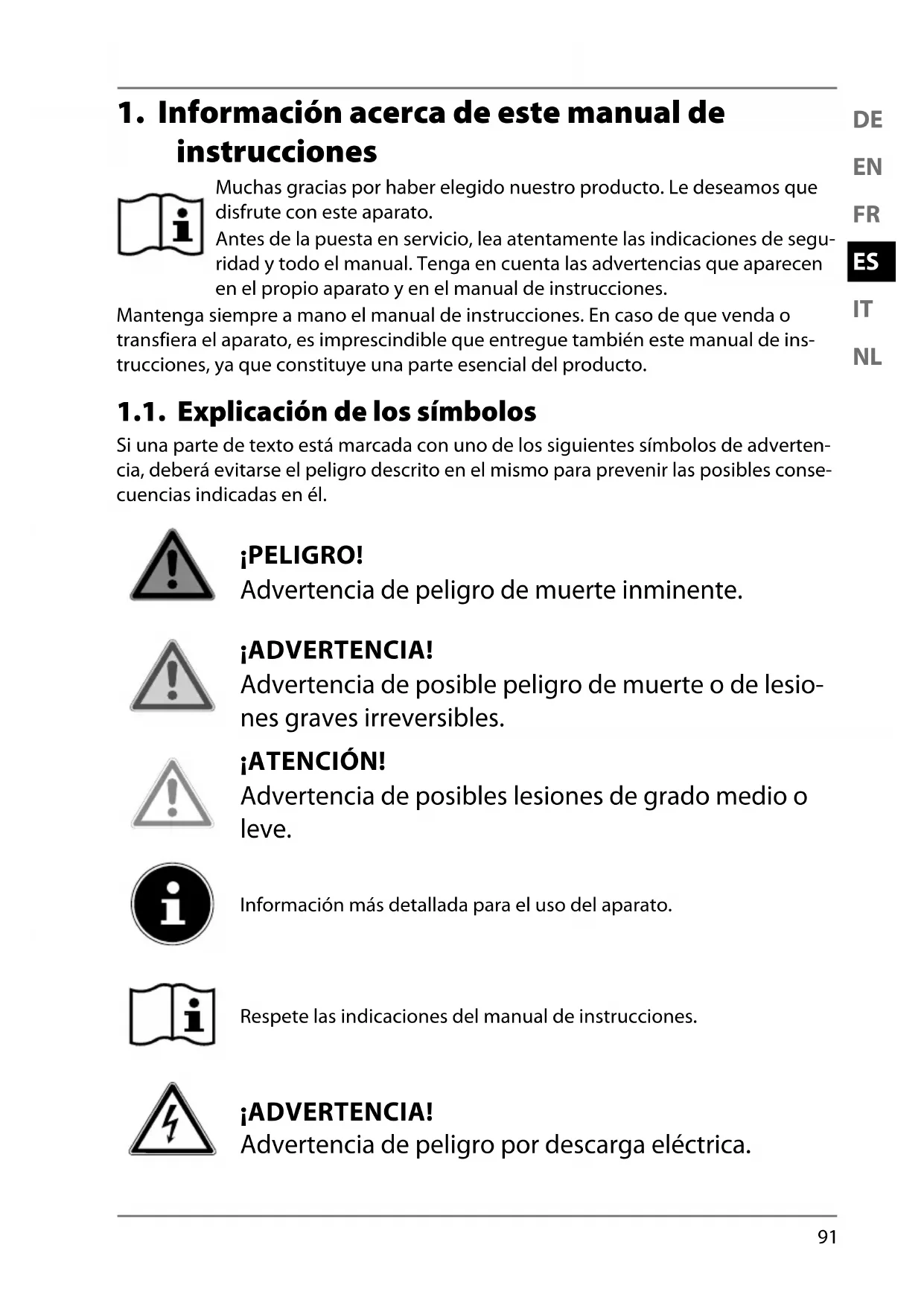 instrucciones Muchas gracias por haber elegido nuestro producto. Le deseamos que disfrute con este aparato. Antes de la puesta en servicio, lea atentamente las indicaciones de segu- ridad y todo el manual. Tenga en cuenta las advertencias que aparecen en el propio aparato y en el manual de instrucciones. Mantenga siempre a mano el manual de instrucciones. En caso de que venda o transfiera el aparato, es imprescindible que entregue también este manual de ins- trucciones, ya que constituye una parte esencial del producto. 1.1. Explicación de los símbolos Si una parte de texto está marcada con uno de los siguientes símbolos de adverten- cia, deberá evitarse el peligro descrito en el mismo para prevenir las posibles conse- cuencias indicadas en él. ¡PELIGRO! Advertencia de peligro de muerte inminente. ¡ADVERTENCIA! Advertencia de posible peligro de muerte o de lesio- nes graves irreversibles. ¡ATENCIÓN! Advertencia de posibles lesiones de grado medio o leve. Información más detallada para el uso del aparato. Respete las indicaciones del manual de instrucciones. ¡ADVERTENCIA! Advertencia de peligro por descarga eléctrica.92 ¡ADVERTENCIA! Advertencia de peligro por sustancias explosivas. ¡ADVERTENCIA! Advertencia de peligro por corrosión cutánea. ¡ADVERTENCIA! ¡Advertencia de peligro por volumen excesivo!