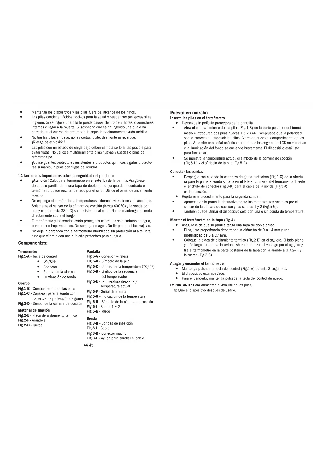 - Conectar con el dispositivo móvil y Inicie la aplicación y siga las instrucciones que muestra la aplicación para conectarse. y Mantenga pulsada la tecla del control (Fig.1-A) durante 3 segundos y encienda el termómetro. y Para emparejar, pulse brevemente la tecla de control. y No tiene que repetir el procedimiento de emparejamiento para otras aplicacio- nes, a menos que cambie a otro móvil. Google Play and the Google Play logo are trademarks of Google LLC. Android is a trademark of Google LLC. Apple, Apple Watch, iPad, iPod, iPod touch, and iPhone, are trademarks of Apple Inc., registered in the U.S. and other coun- tries. App Store is a service mark of Apple Inc., registered in the U.S. and other countries. IOS is a trademark or registered trademark of Cisco in the U.S. and other countries and is used under license. HyperBBQ App (Fig.6) La apariencia puede diferir entre iOS y Android™, y también puede cambiar después de una actualización. Por favor, siga siempre las instrucciones vigentes en la aplicación. Fig. 6-A - Opciones Fig. 6-B - Estado de la conexión Fig. 6-C - Duración Fig. 6-D - Timer Fig. 6-E - Función fotográca Fig. 6-F - Temperatura actual de la sonda 1 Fig. 6-G - Sonda 1 y 2 con marca de color seleccionada Fig. 6-H - Plato seleccionado con temperatura deseada Fig. 6-J - Temperatura actual de la cámara de cocción Fig. 6-K - Sensor de la cámara de cocción con marca de color seleccionada Fig. 6-L - Plato seleccionado con el límite inferior/superior Fig. 6-M - Símbolo de pila para el termómetro Fig. 6-N - Conguración del dispositivo Control de la temperatura durante el asado y El dispositivo puede utilizarse para controlar la temperatura de la cámara de cocción en la parrilla y la temperatura interna de un máximo de dos piezas de carne. y Conecta las dos sondas de inserción. Para medir la temperatura interna de la carne, introduzca la sonda correspondiente a una profundidad de al menos 2-3 cm en el centro de la parte más gruesa de la carne; en caso de carne de ave, entre la pechuga y el muslo; no debe tocar hueso ni cartílago ni sobresalir de la carne. La sonda permanece en la carne durante todo el proceso de asado. y Para sujetar la sonda a la parrilla recomendamos los clips para termómetros para carne (cat. no. 30.3525.60). y Dirigir el cable hacia el exterior. Cierre la tapa. Atención en el caso de bastido- res y bisagras con cantos vivos. No utilice la ayuda para enrollar el cable en la parrilla. y En la aplicación, seleccione el sensor de la cámara de cocción y los dos son- das uno tras otro y realice los ajustes deseados. Seleccione una temperatura preestablecida por tipo de carne y nivel de cocción deseada, o introduzca una temperatura deseada personalizada o límites superior y inferior. Según el tipo de carne, hay diferentes niveles de cocción disponibles. y Las temperaturas actuales y las temperaturas deseadas se muestran en la aplicación y alternativamente en la pantalla del termómetro. Alarma de temperatura y Los ajustes de la alarma se pueden congurar en la aplicación. y La alarma se activa en el termómetro y en la aplicación y cuando se alcanza la temperatura interna ajustada y cuando la temperatura excede el límite superior ajustado y cuando la temperatura cae por debajo del límite inferior ajustado y cuando el timer ha expirado. y Pulse la tecla del control (Fig.1-A) en el termómetro para apagar la alarma. y La alarma vuelve a activarse después de un intervalo seleccionable mientras exista la condición de alarma. Iluminación y Pulse la tecla del control (Fig.1-A) en el termómetro. y La iluminación de fondo se activa brevemente. Cuidado y mantenimiento y Limpie el termómetro y la sonda con un paño suave, ligeramente humedecido. ¡No utilice productos abrasivos o disolventes! No sumerja los dispositivos en agua. y En caso de que la toma tenga contacto con agua o vapor, puede afectar el contacto al cable de la sonda. Seque usted el enchufe antes de usarlo con un paño, antes de enchufar en el termómetro. y Apague el dispositivo después de uso. Utilice las caperuzas de protección de goma para las tomas. y Extraiga las pilas si no va a usar el dispositivo por un largo período de tiempo.48 49 Cambio de las pilas y El estado de carga de las pilas del termómetro se muestra dividiendo el símbo- lo en tres segmentos (Fig.5-B, Fig.6-M). y Si sólo aparece un segmento, cambie las pilas. Averías Problema Solución Ninguna indicación del termómetro Activar el dispositivo Asegúrese que las pilas estén colocadas con la polaridad correcta Cambiar las pilas Indicación incorrecta Cambiar las pilas Compruebe el contacto del enchufe a la toma, que esté completamente seco No hay contacto entre el termómetro y la aplicación Reducir la distancia entre el dispositivo móvil y el termómetro (máx. 50 m campo libre) Reconectar dispositivos Indicación de temperatura interna demasiado alta/demasiado baja Comprobar la colocación de la sonda Si a pesar de haber seguido estos pasos, el dispositivo no funciona, diríjase al estable- cimiento donde adquirió el producto. Datos técnicos Dimensiones de la instalación: Diámetro del agujero 9 p. 14