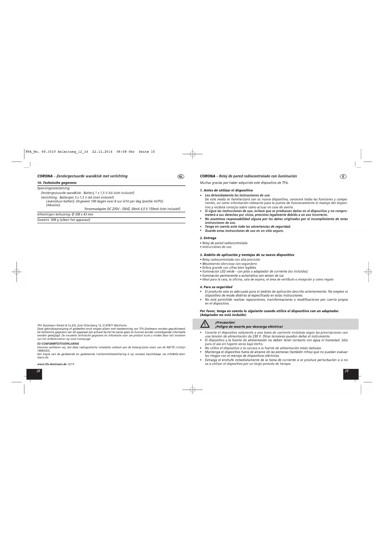 Declaramos que esta instalación de radio cumple con los requisitos fundamentales de la directiva R&TTE 1999/5/CE. Tiene a su disposición una copia firmada y sellada de la Declaración de Conformidad, solicítela al info@tfa-dost- mann.de. www.tfa-dostmann.de 12/14 CORONA – Reloj de pared radiocontrolado con iluminación