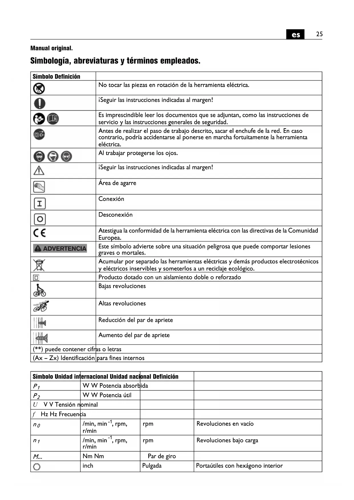 Manual original. Simbología, abreviaturas y términos empleados. Símbolo Definición No tocar las piezas en rotación de la herramienta eléctrica. ¡Seguir las instrucciones indicadas al margen! Es imprescindible leer los documentos que se adjuntan, como las instrucciones de servicio y las instrucciones generales de seguridad. Antes de realizar el paso de trabajo descrito, sacar el enchufe de la red. En caso contrario, podría accidentarse al ponerse en marcha fortuitamente la herramienta eléctrica. Al trabajar protegerse los ojos. ¡Seguir las instrucciones indicadas al margen! Área de agarre Conexión Desconexión Atestigua la conformidad de la herramienta eléctrica con las directivas de la Comunidad Europea. Este símbolo advierte sobre una situación peligrosa que puede comportar lesiones graves o mortales. Acumular por separado las herramientas eléctricas y demás productos electrotécnicos y eléctricos inservibles y someterlos a un reciclaje ecológico. Producto dotado con un aislamiento doble o reforzado Bajas revoluciones Altas revoluciones Reducción del par de apriete Aumento del par de apriete (**) puede contener cifras o letras (Ax – Zx) Identificación para fines internos ADVERTENCIA Símbolo Unidad internacional Unidad nacional Definición
